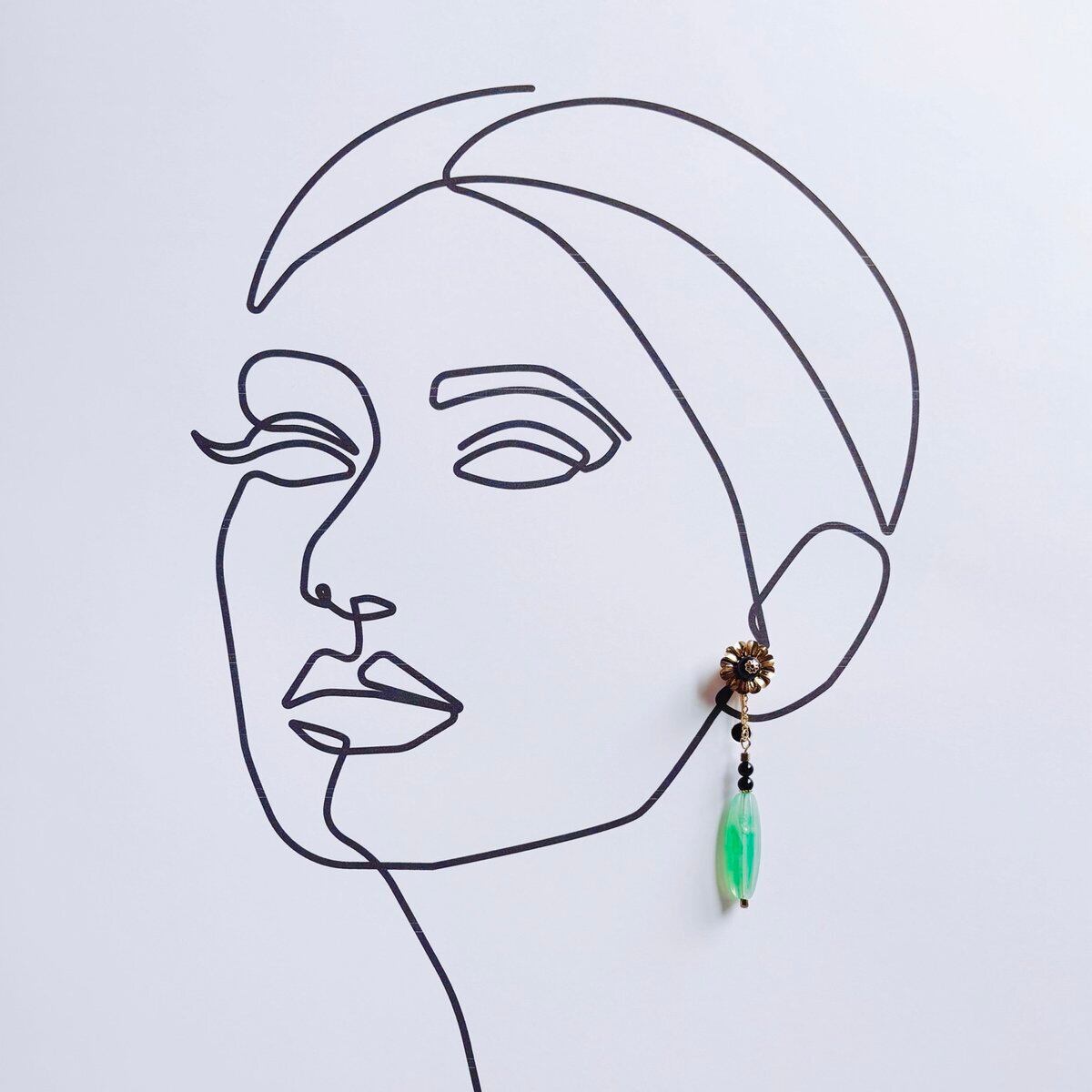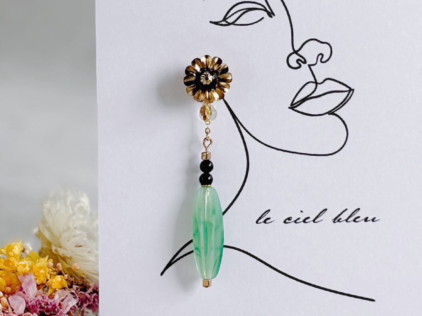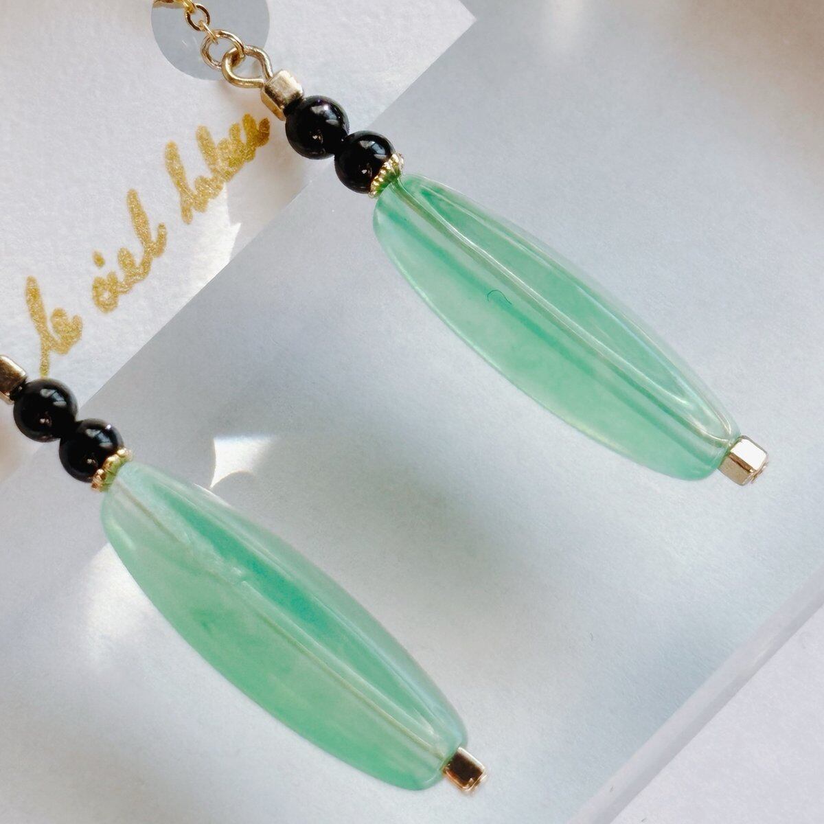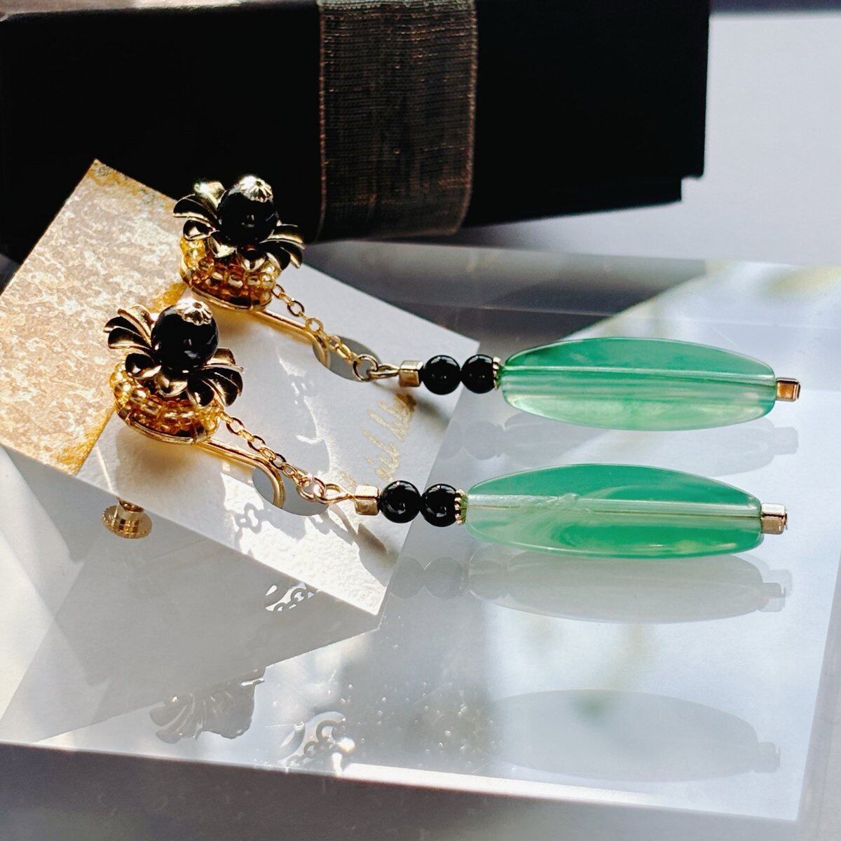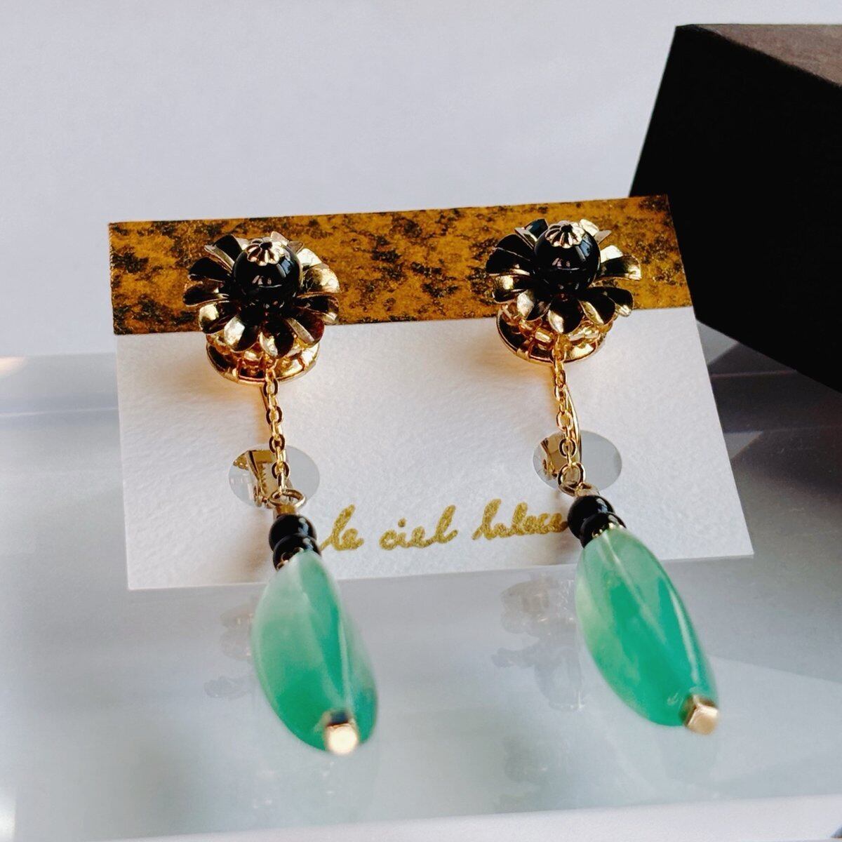 黒・緑・金で色合いをまとめ、細かい部分にも部材をこだわったイヤリングとなっております。