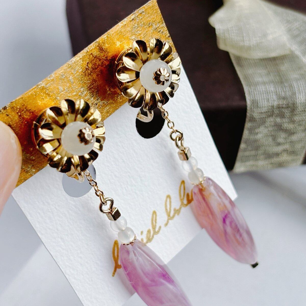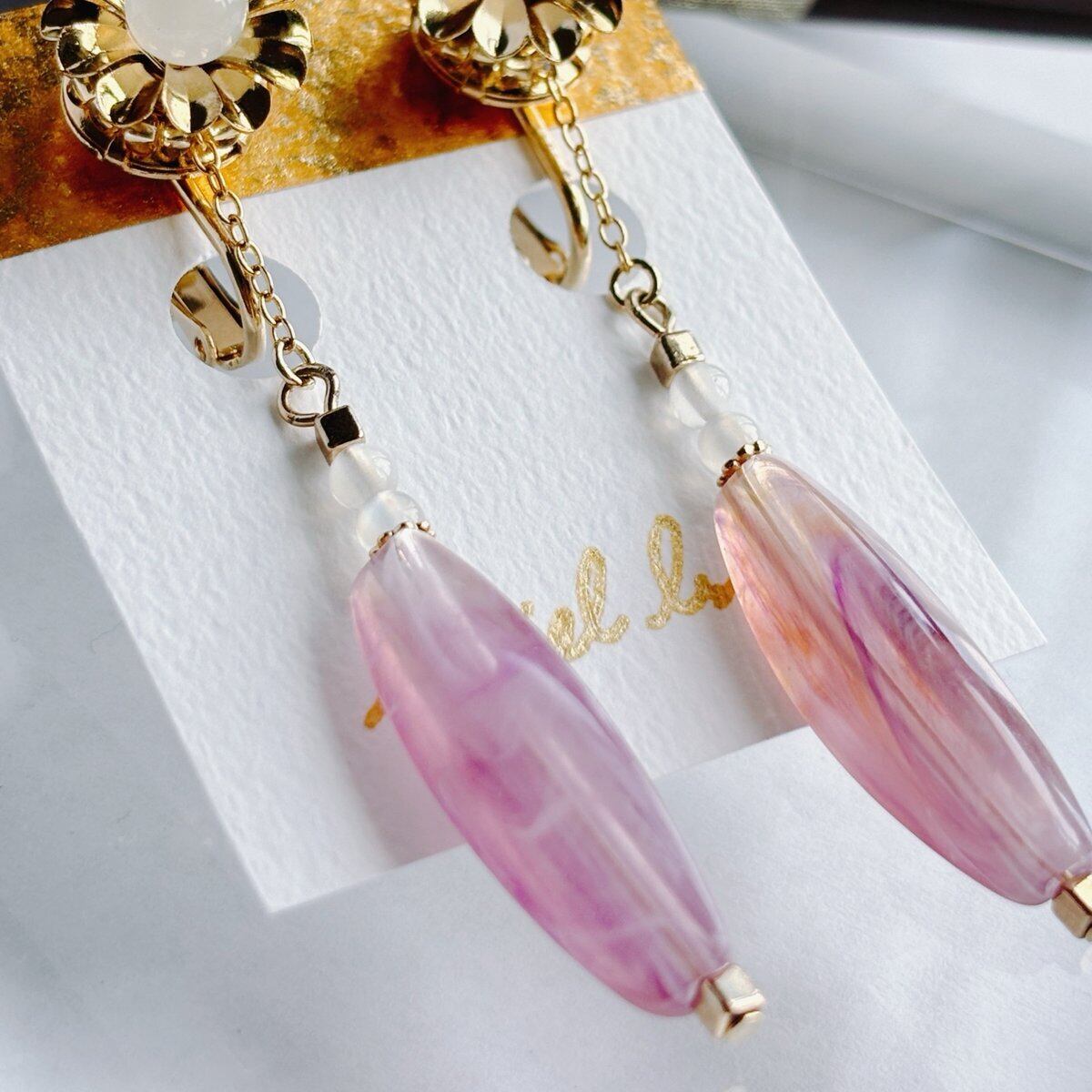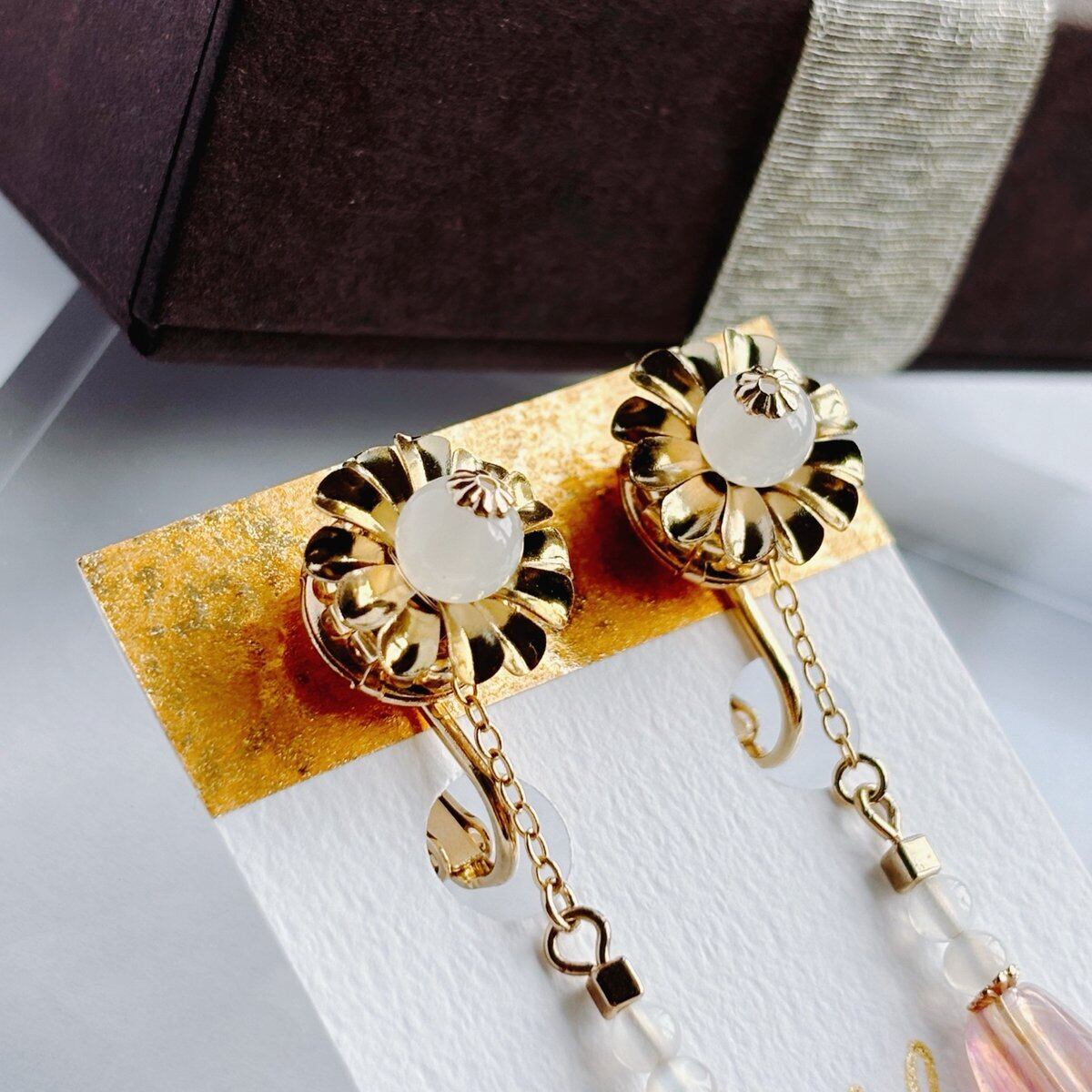 白・ピンク・金で色合いをまとめ、細かい部分にも部材をこだわったイヤリングとなっております。