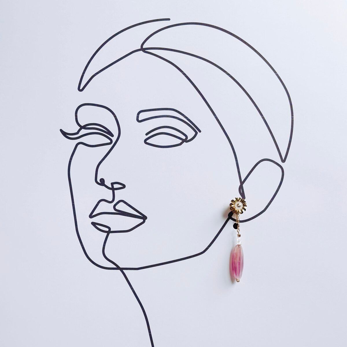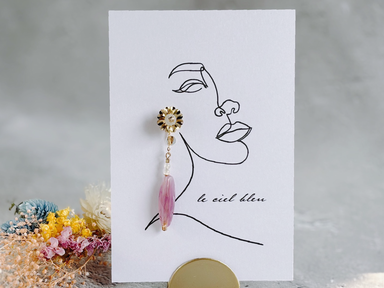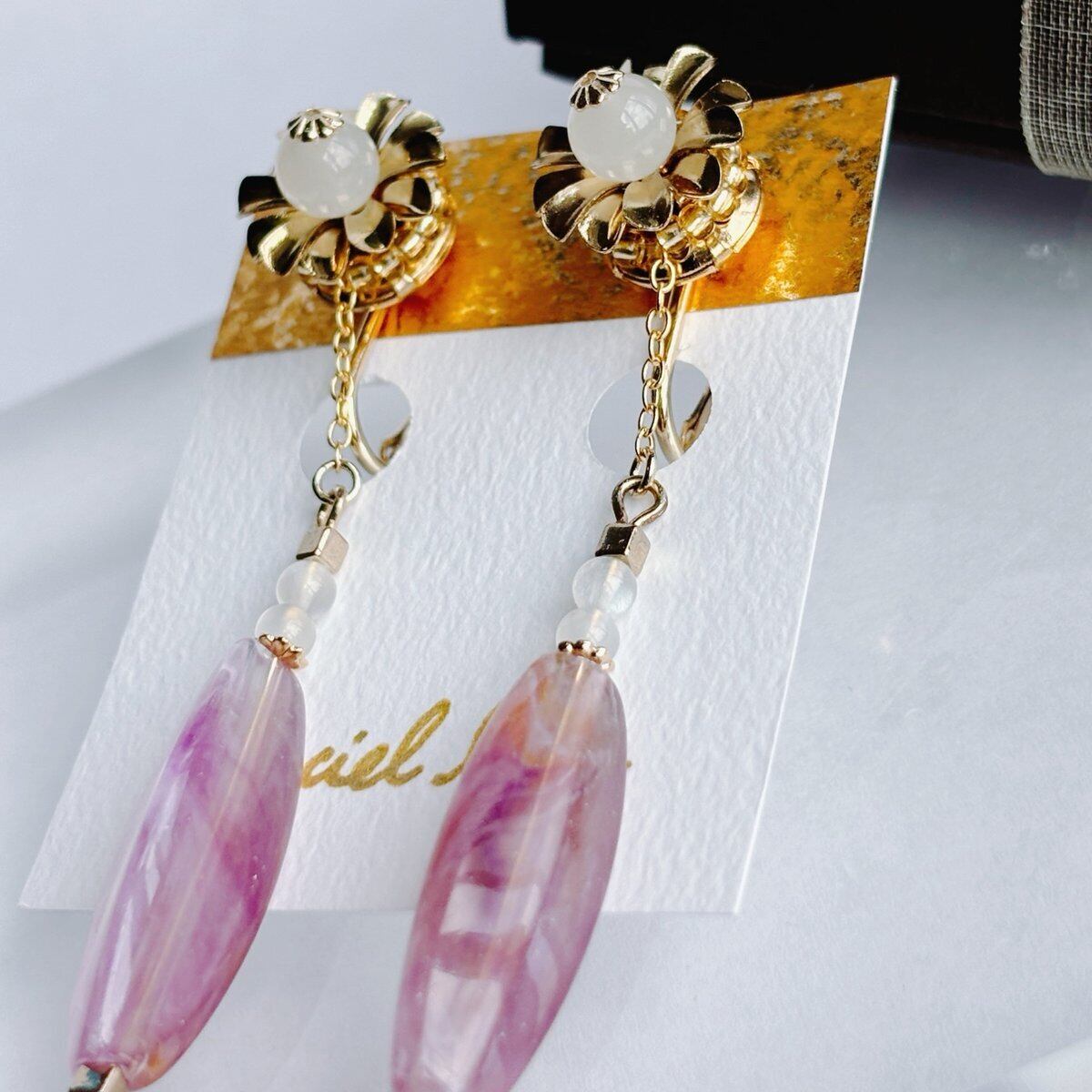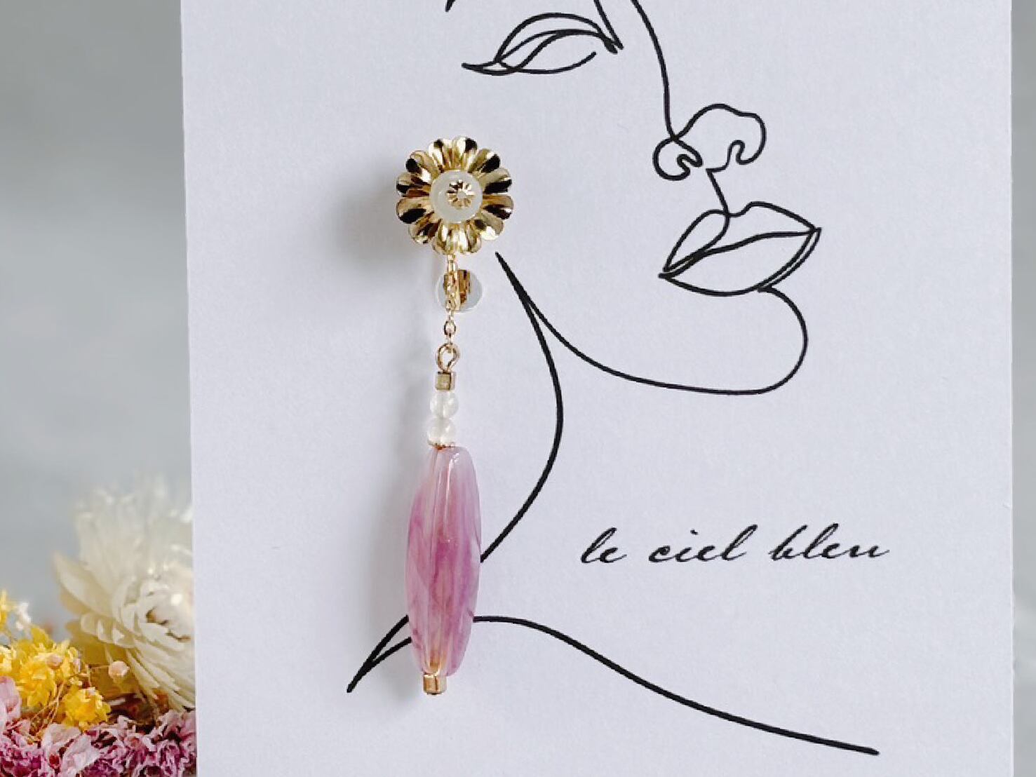 白・ピンク・金で色合いをまとめ、細かい部分にも部材をこだわったイヤリングとなっております。