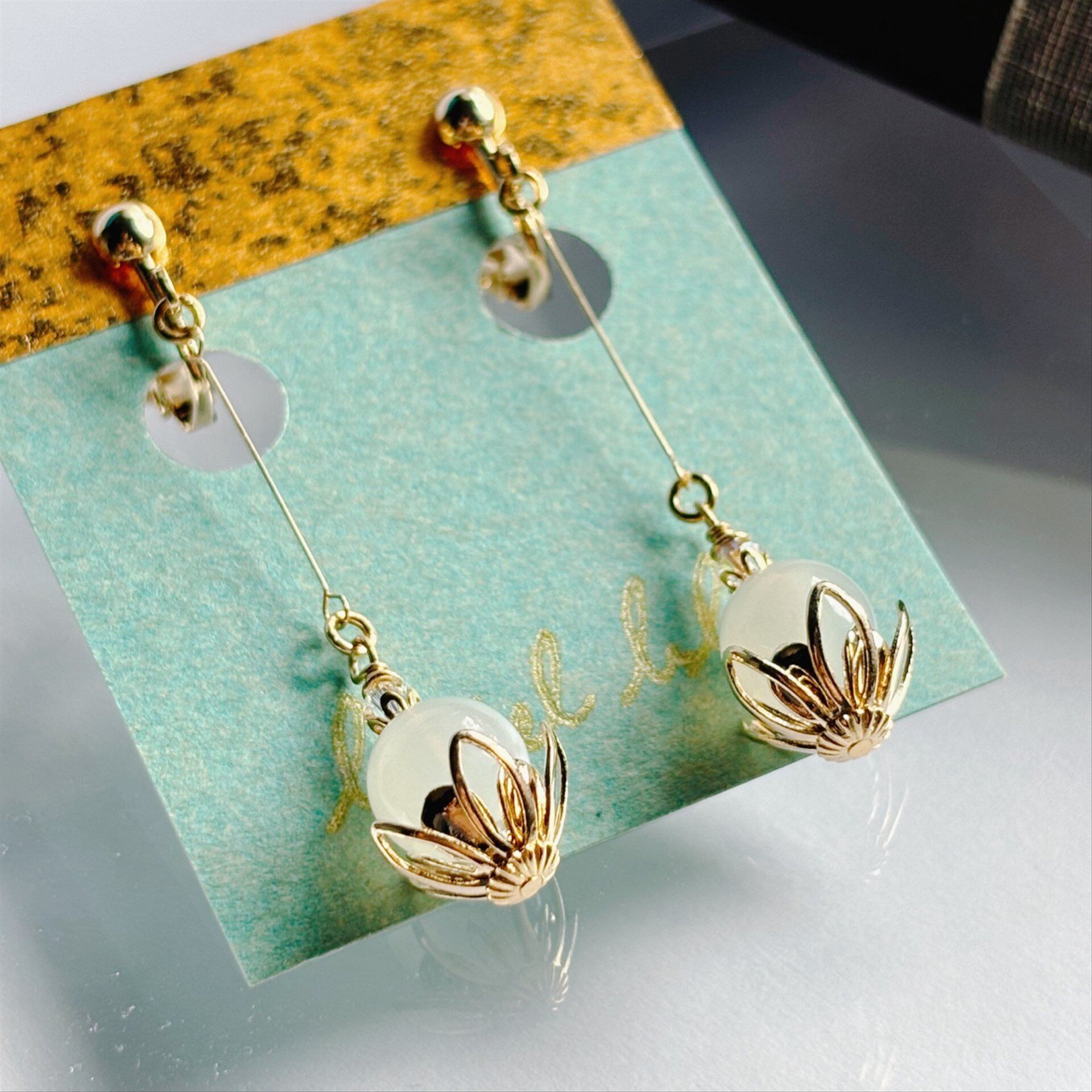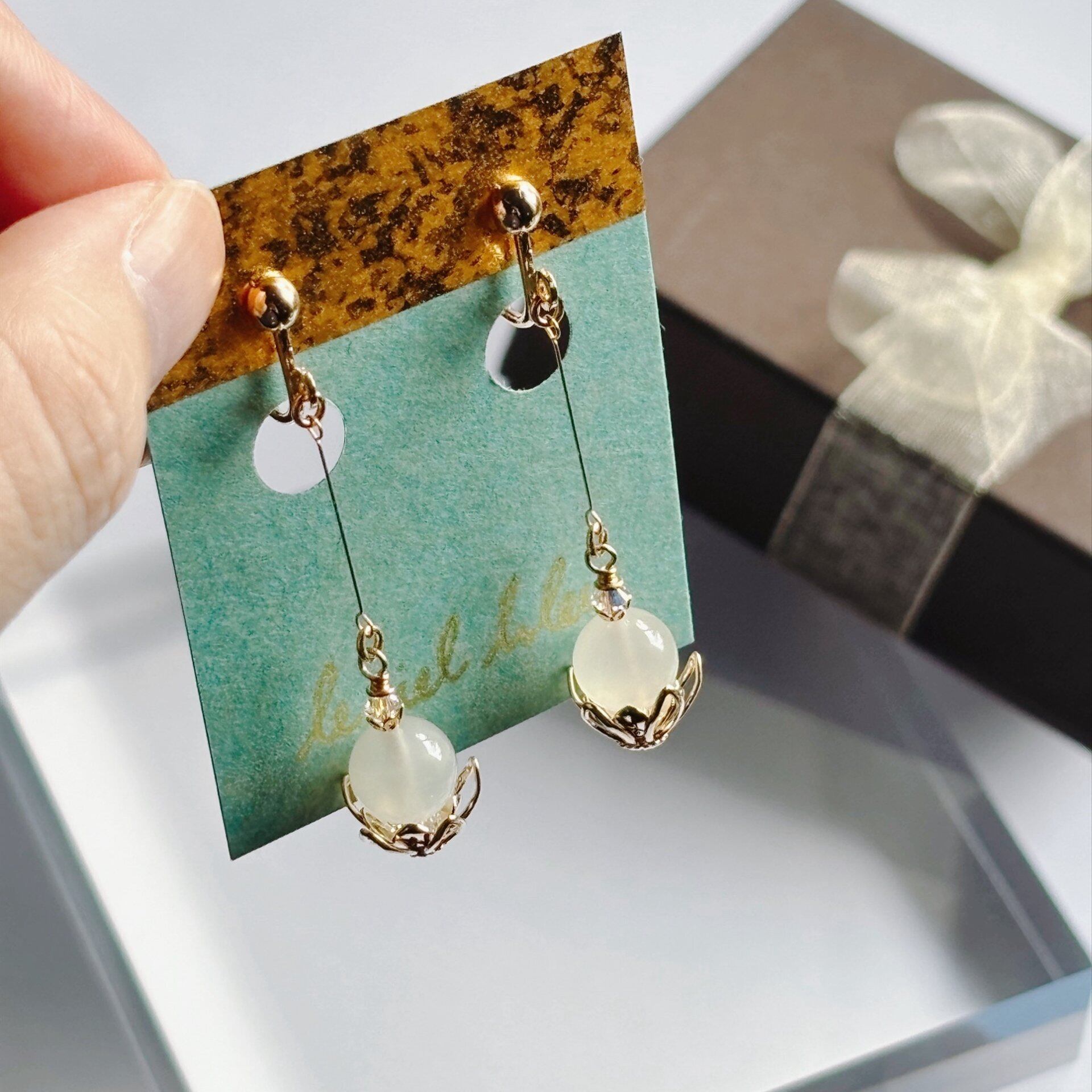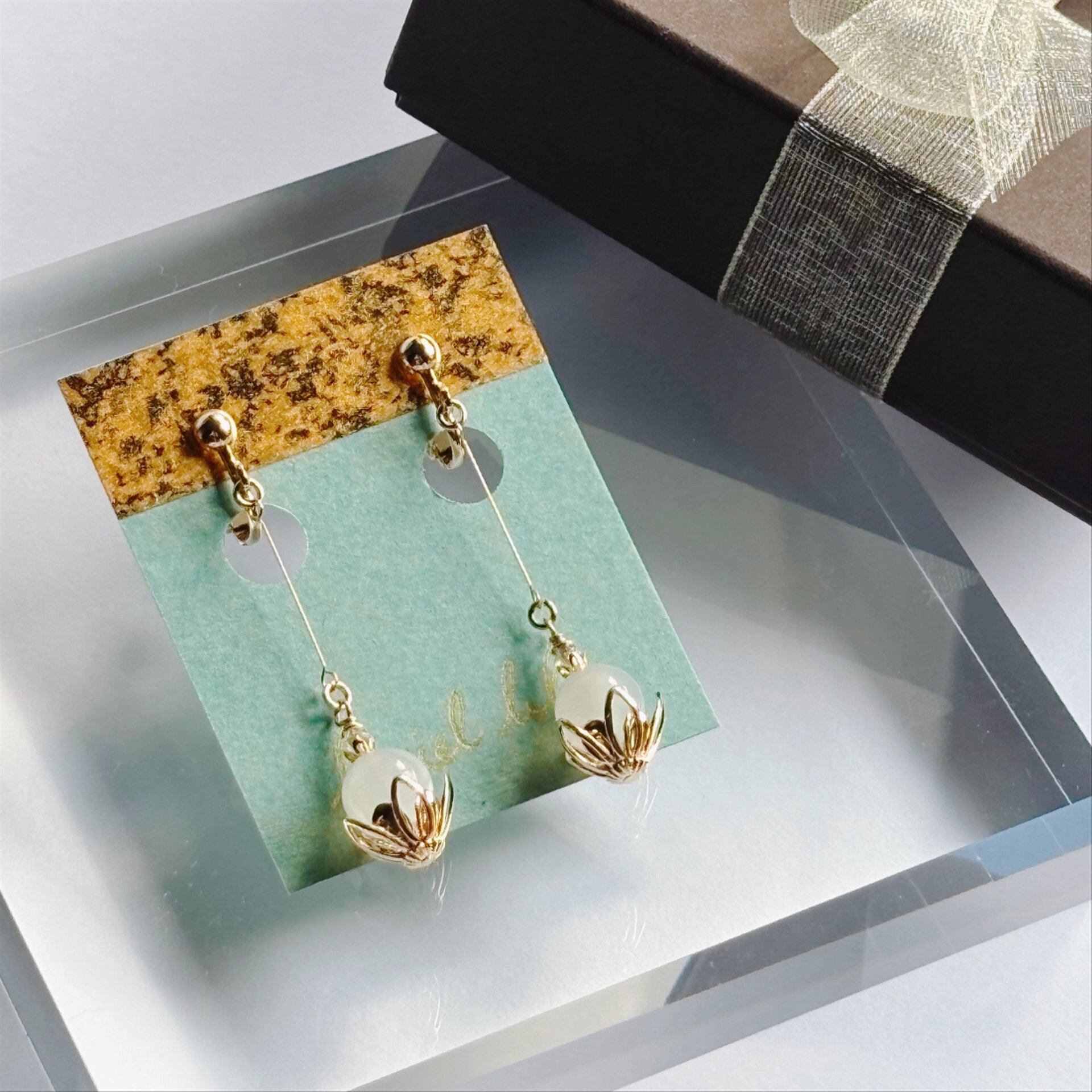 【大人華やか】をモチーフに、天然石ムーンストーンとゴールドパーツにてイヤリングを作成いたしました。