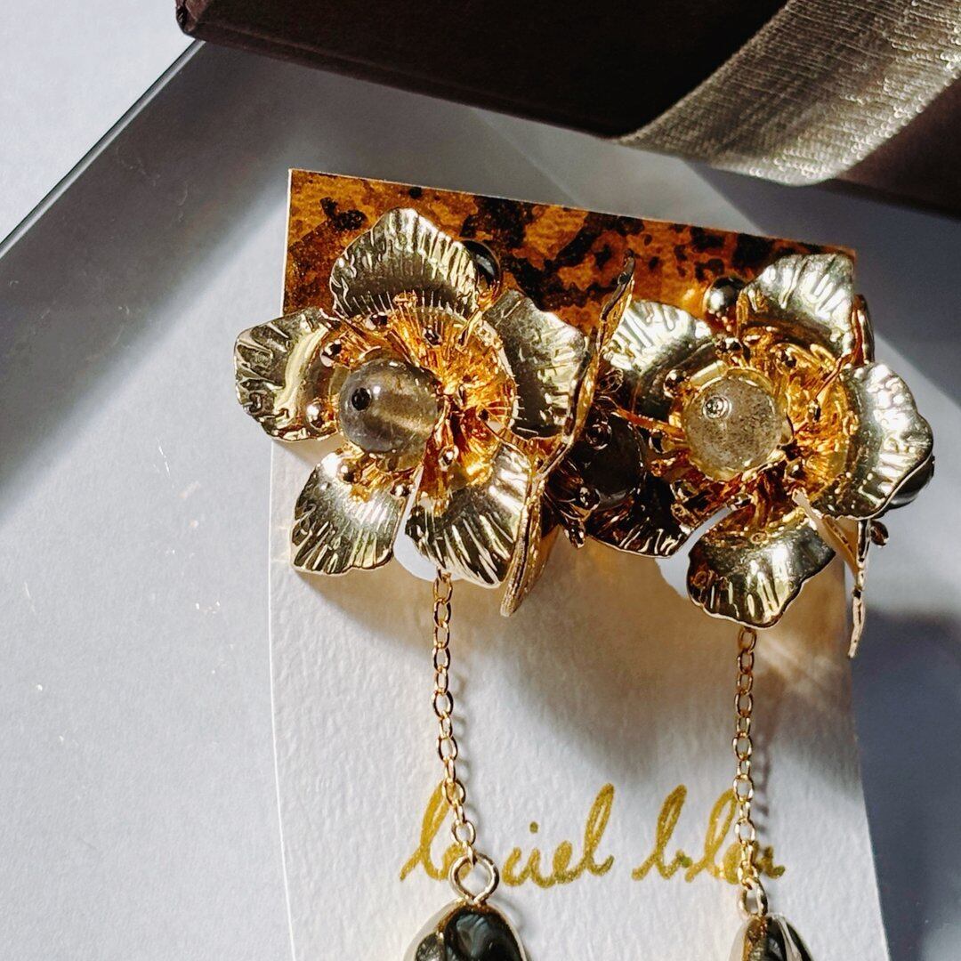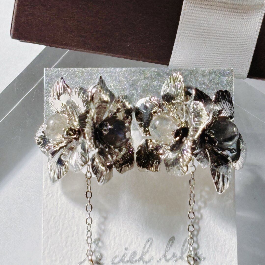 花の華やかボリュームイヤリング ラブラドライト ゴールド/シルバー