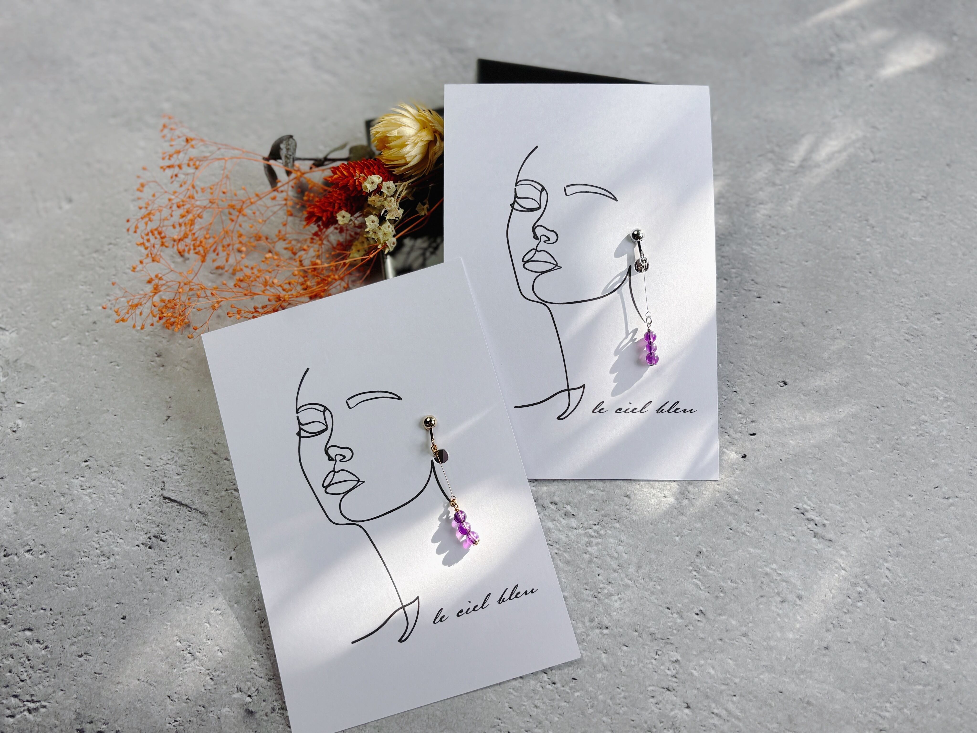 厚みのあるアクセサリーは写真左側のように1枚に両耳をつけたデザインにつけて、厚みのないアクセサリーは写真右側のようにそれぞれのモデルになってくれているデザインに片耳をつけて2枚にしてお送りいたします。
