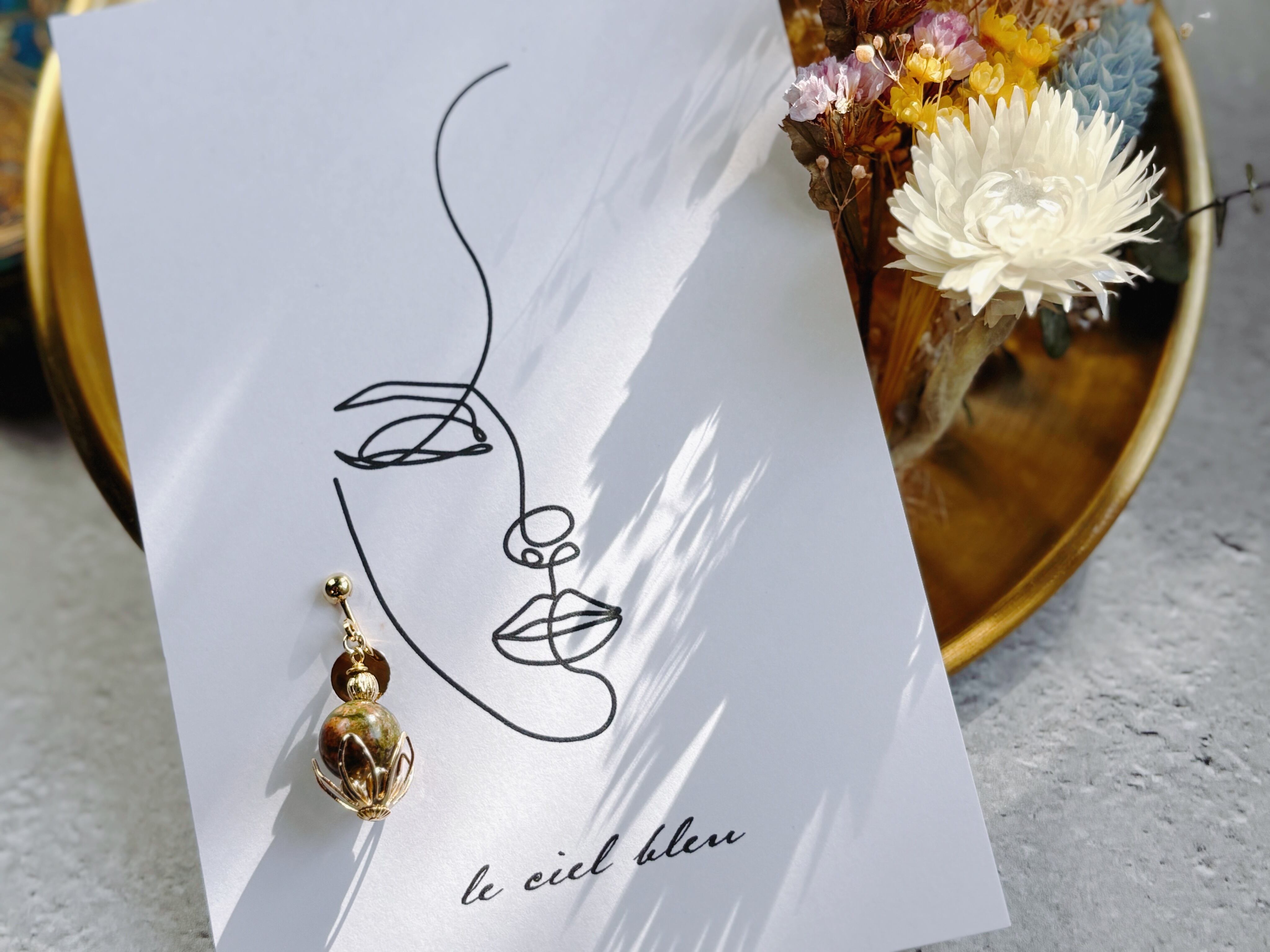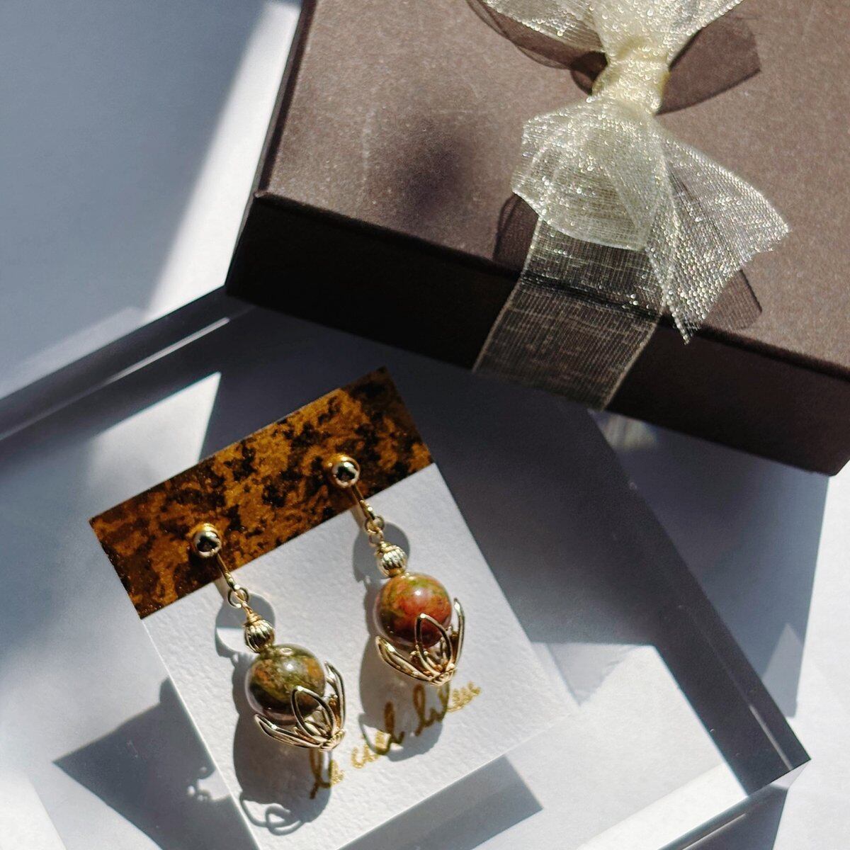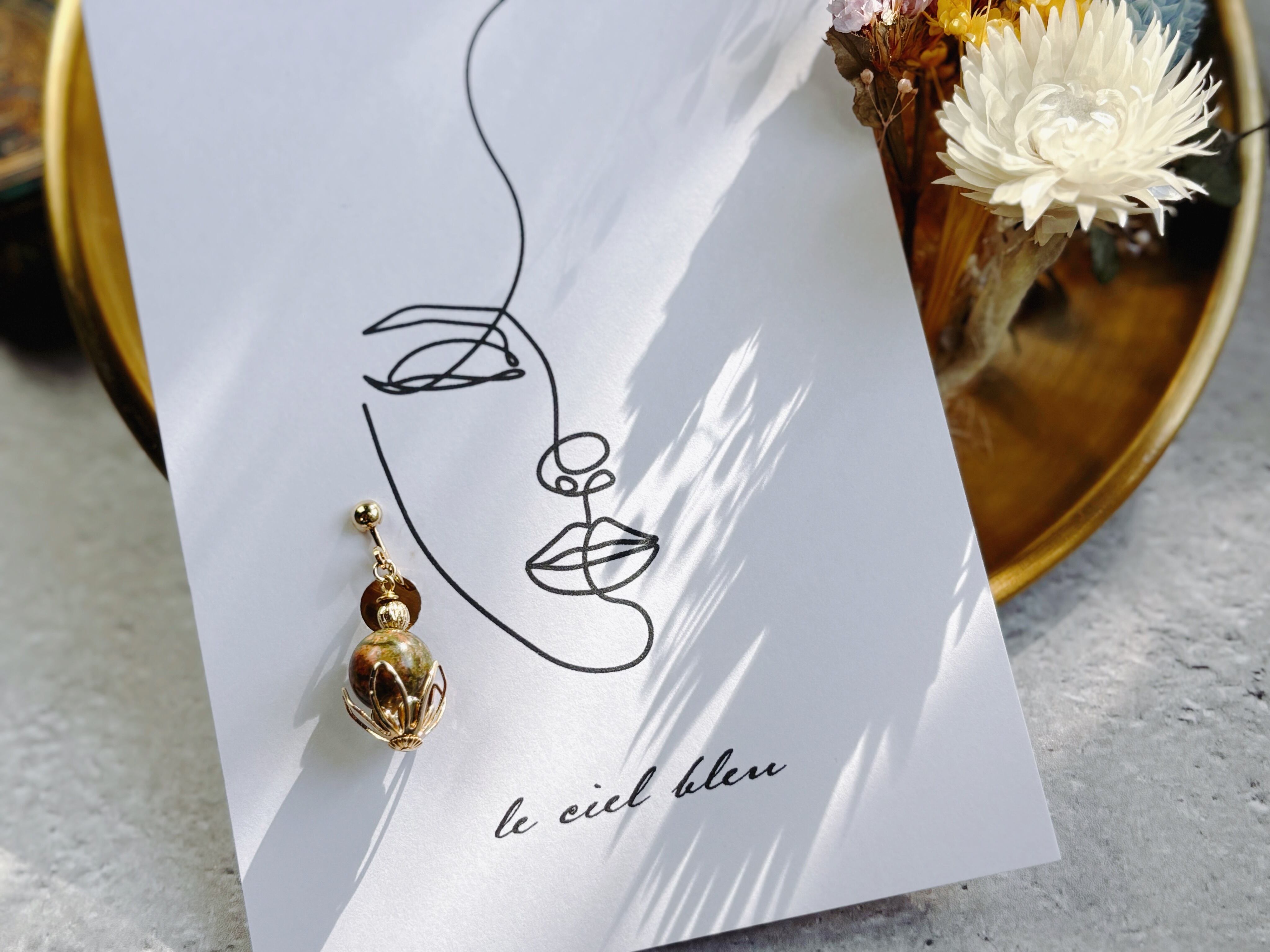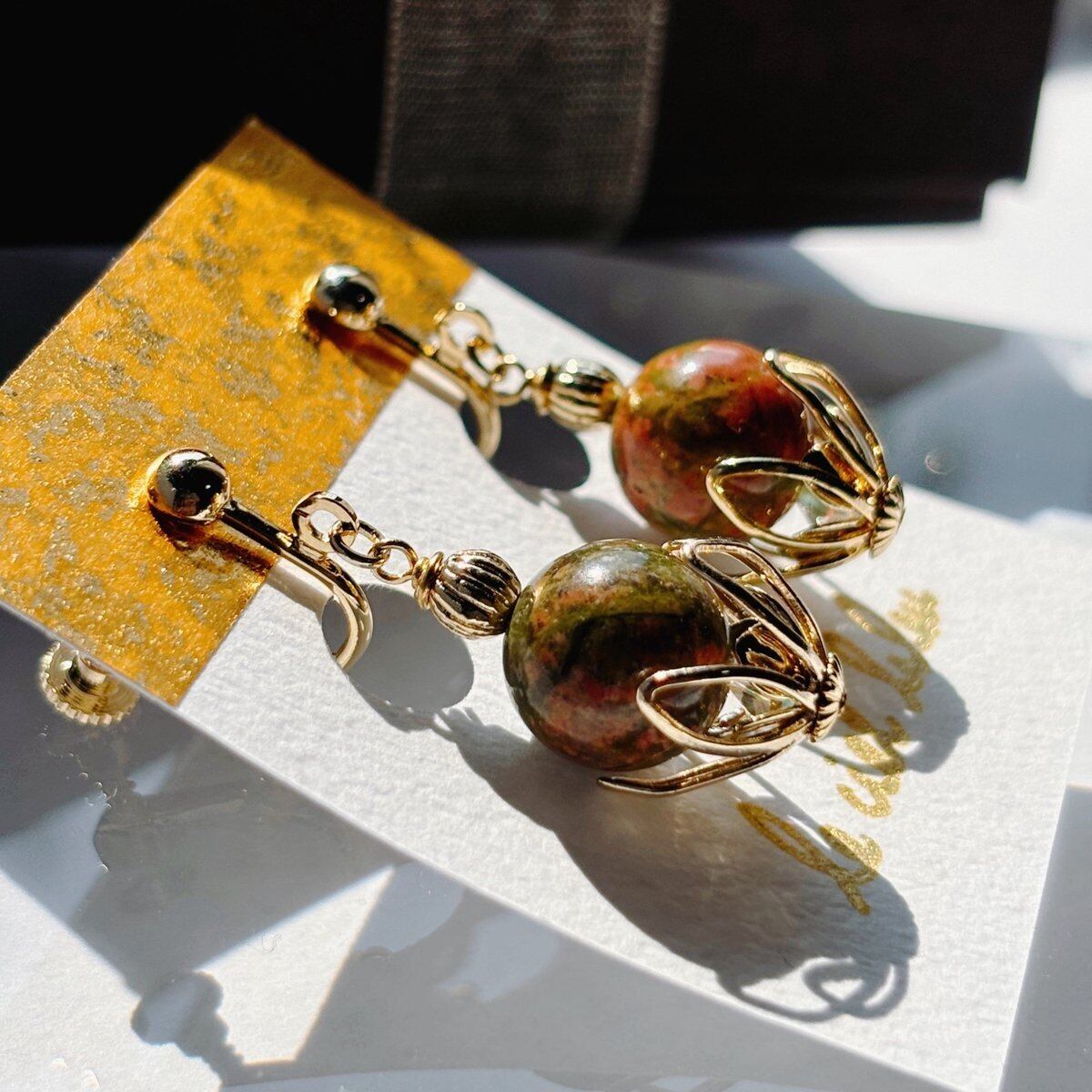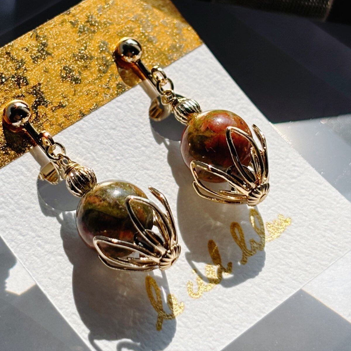 天然石ユナカイトも大粒10mmを使用しているため、物足りなさは感じない、存在感のあるイヤリングになっているかと思います。