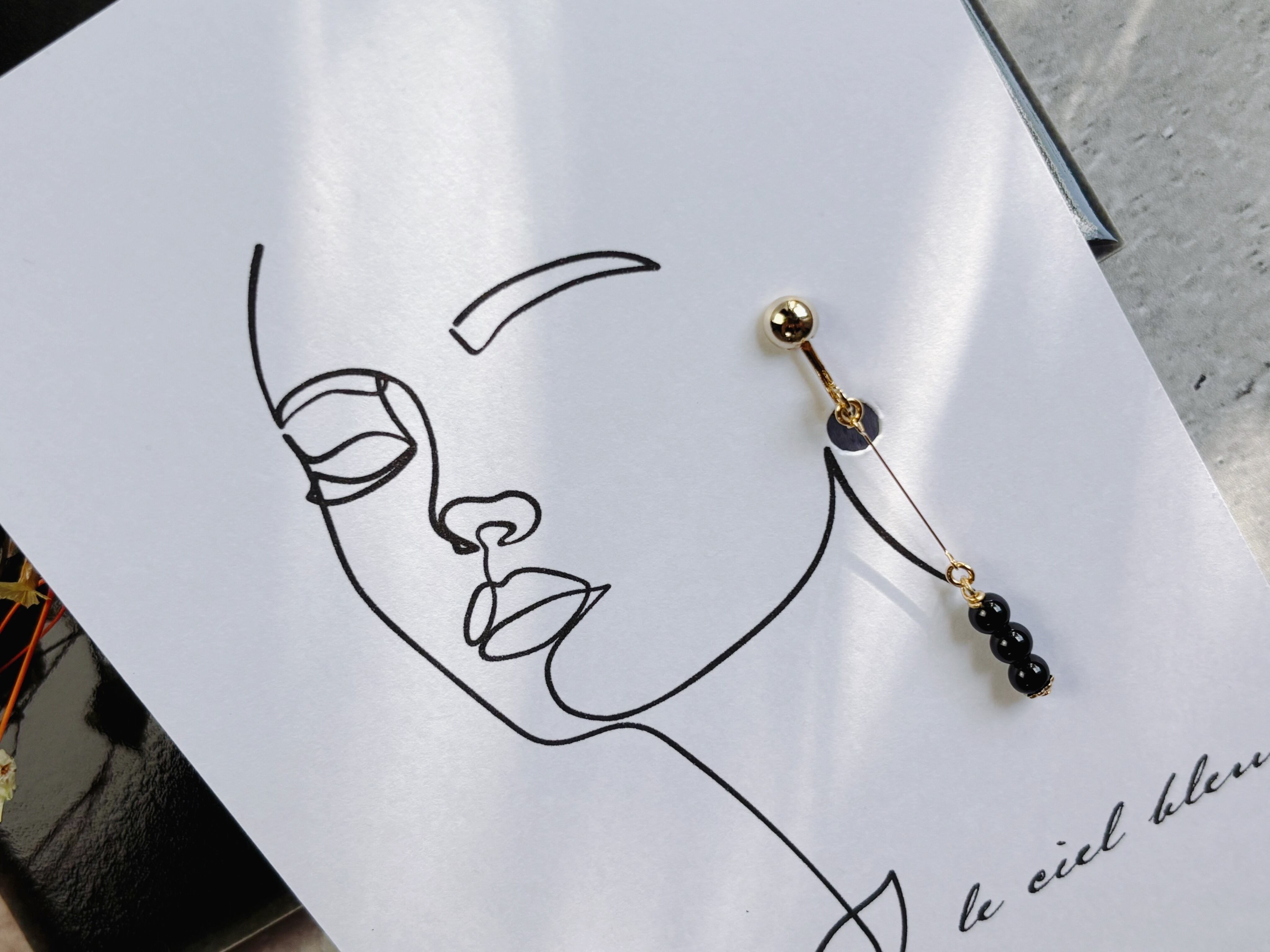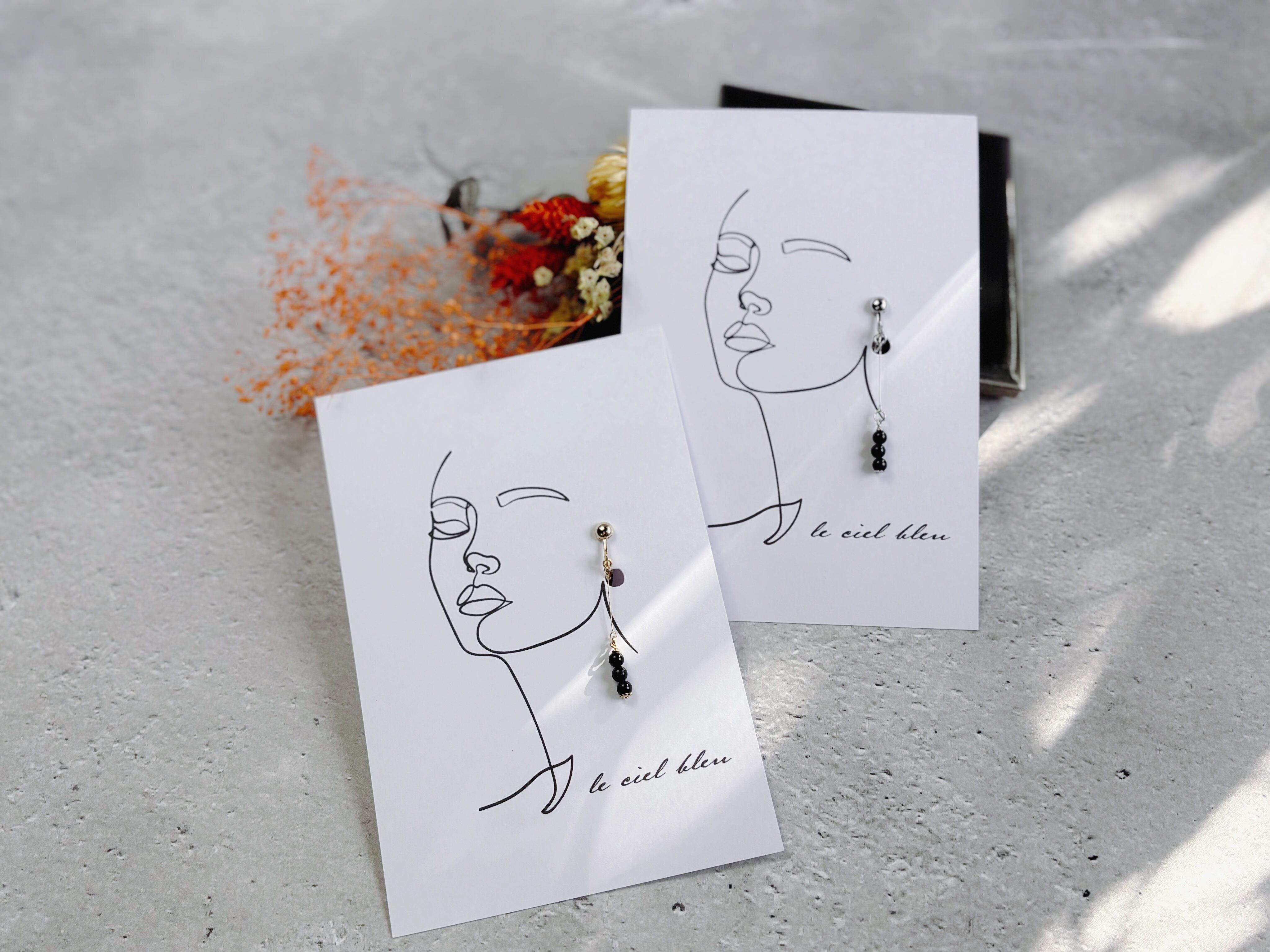 厚みのあるアクセサリーは写真左側のように1枚に両耳をつけたデザインにつけて、厚みのないアクセサリーは写真右側のようにそれぞれのモデルになってくれているデザインに片耳をつけて2枚にしてお送りいたします。
