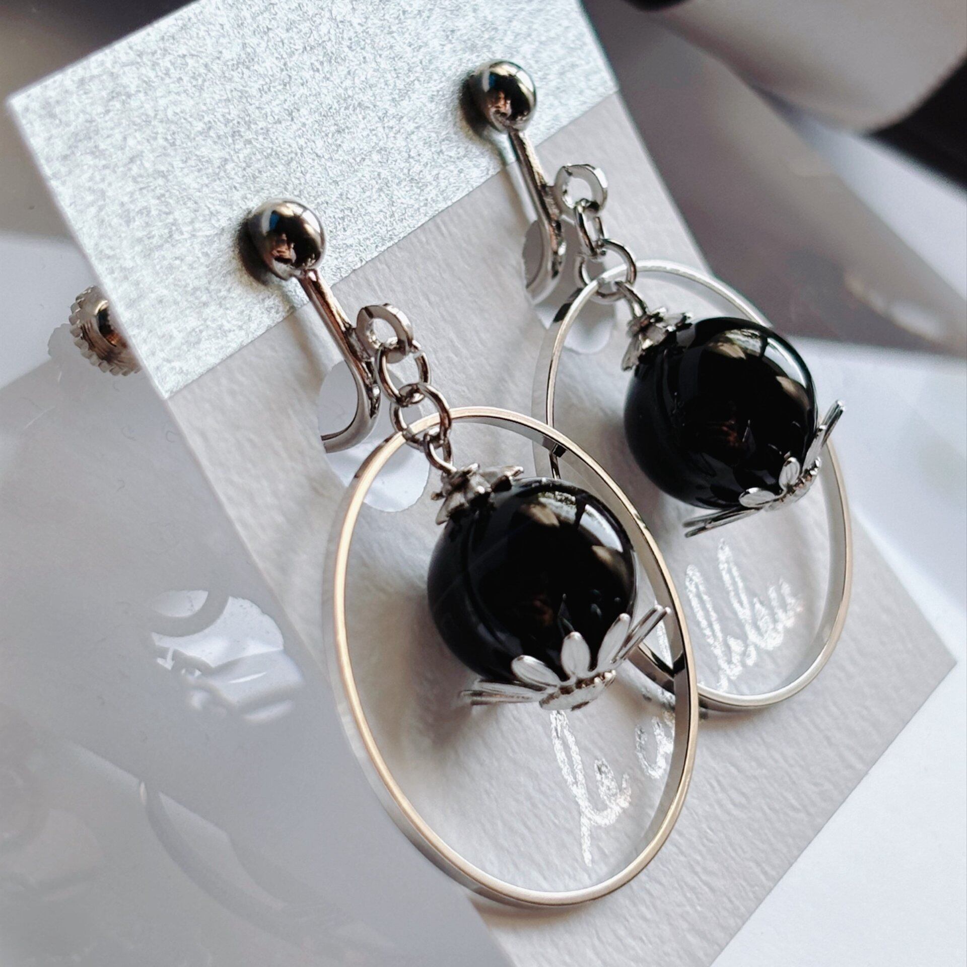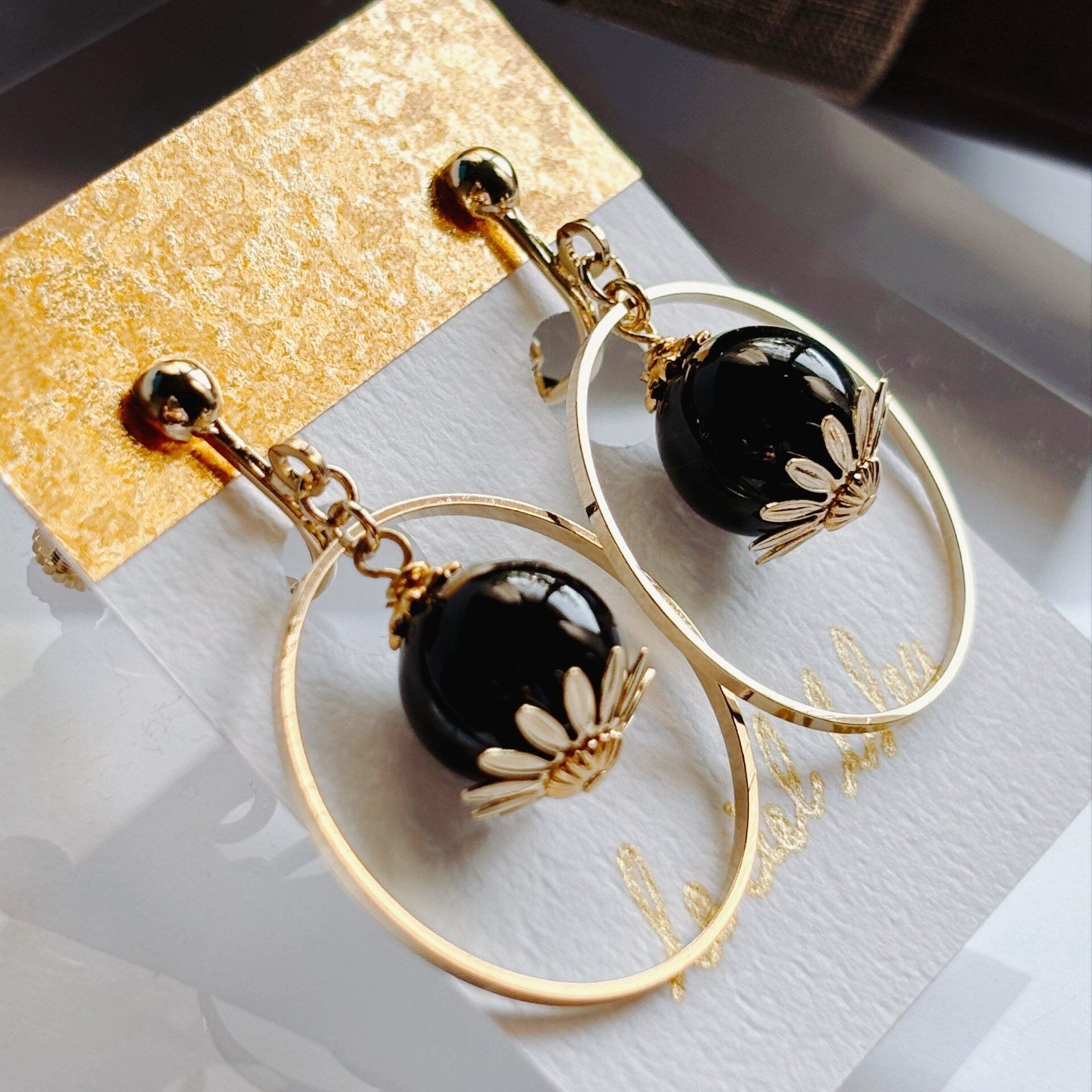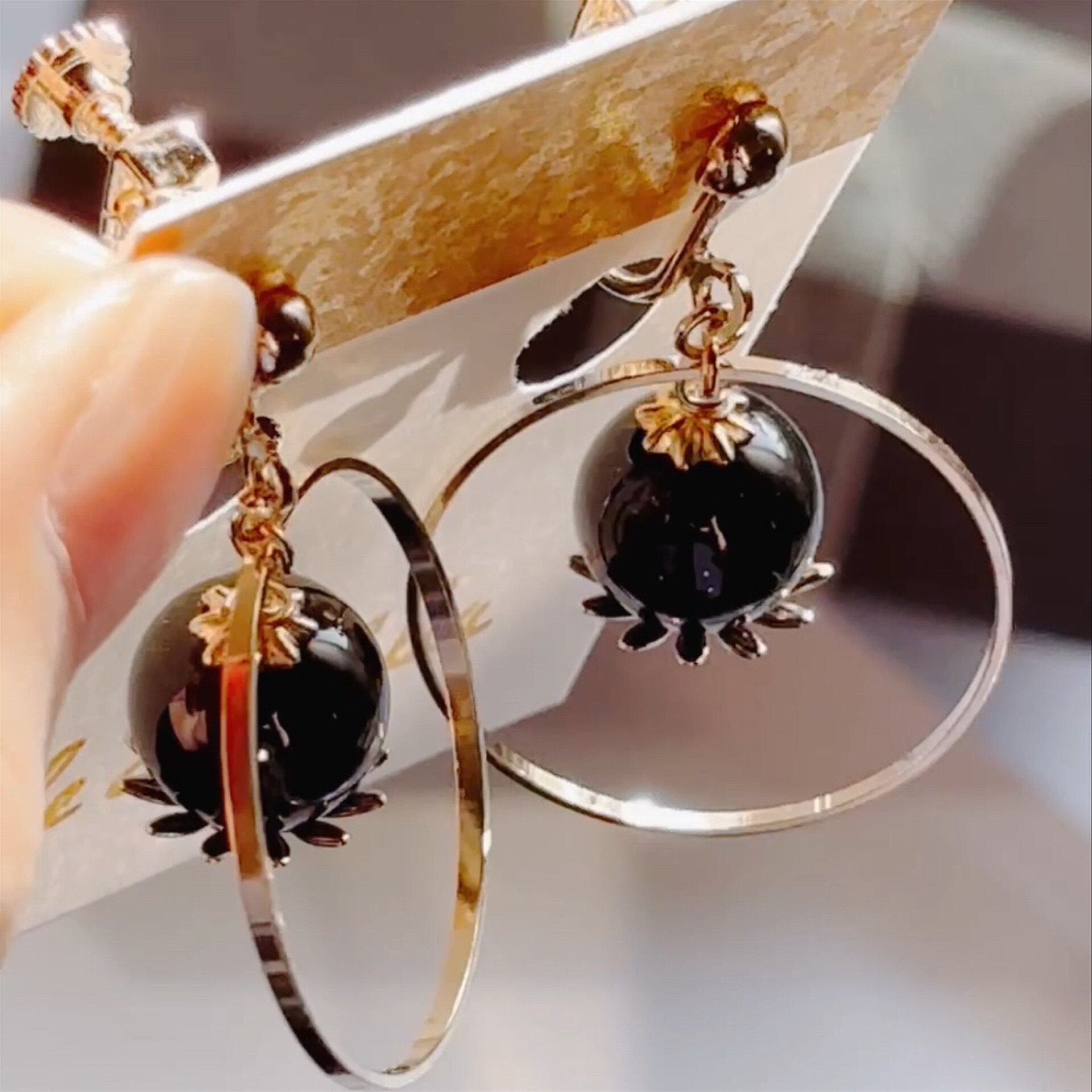 天然石とリングの揺れイヤリング オニキス ゴールド/シルバー