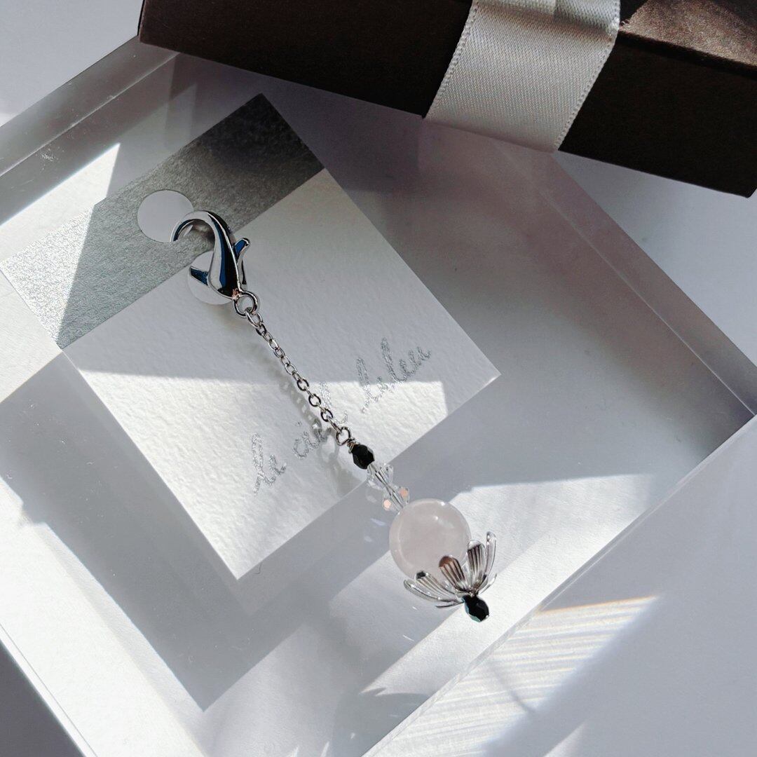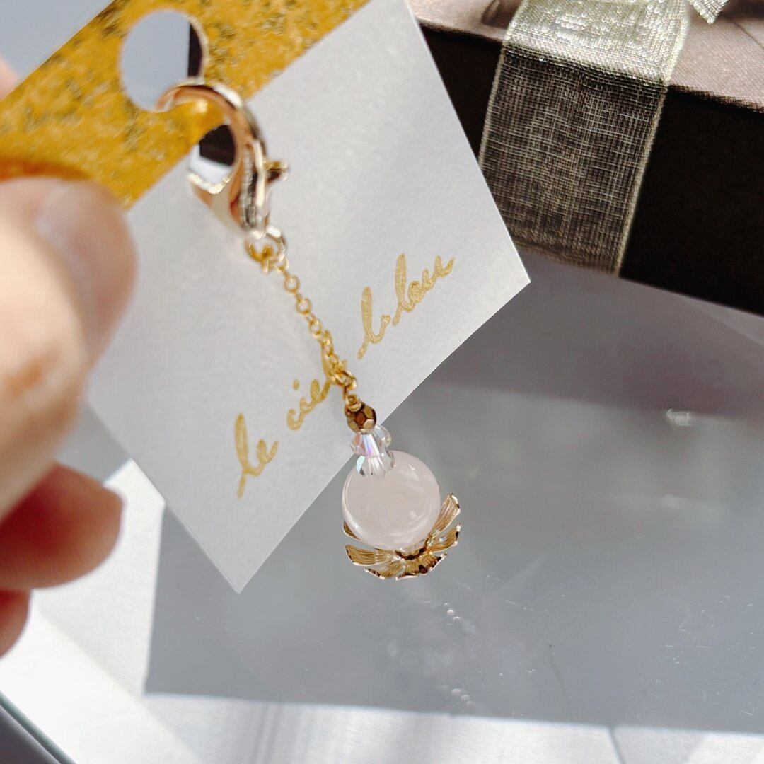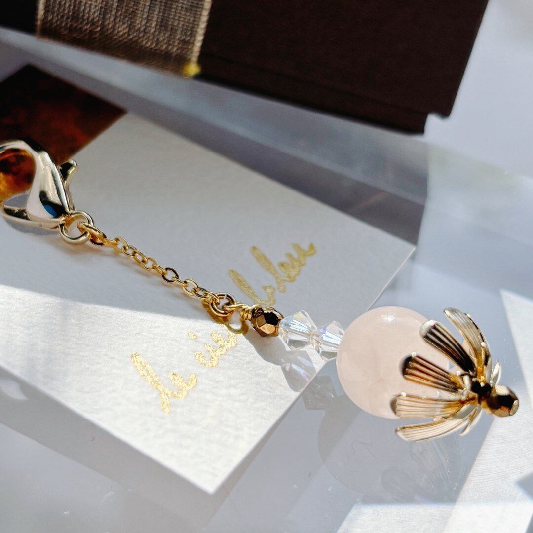 こちらのキーホルダーは【大人華やか】をモチーフに、女性の魅力を高めると人気の天然石【ローズクォーツ】の10mmという大粒を使用し、どの年代の方でもおしゃれにカバンやキーケースなどに付けていただけるデザインです。