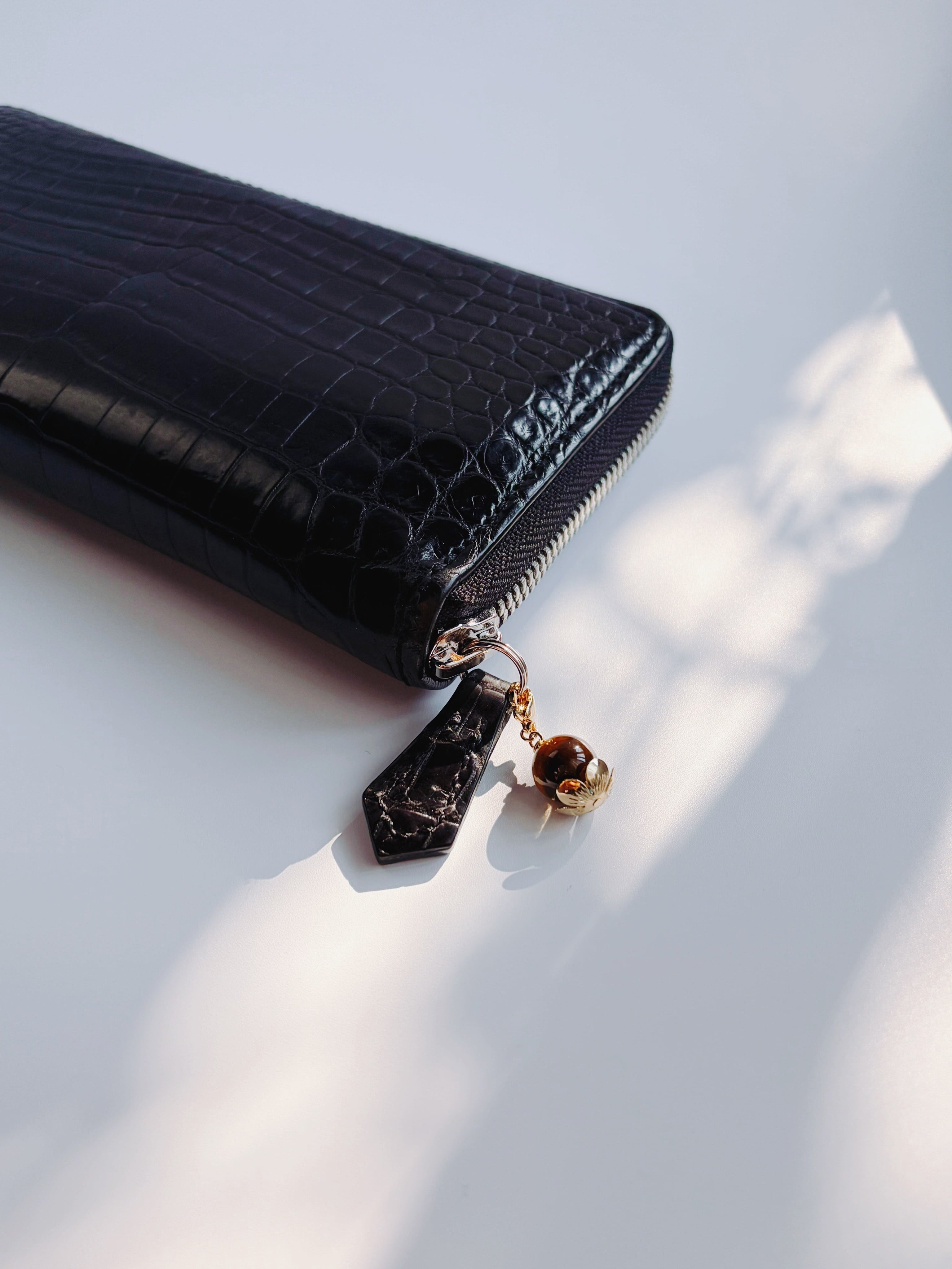 天然石を包み込む繊細な座金パーツが、お財布に優美な彩りを添えるデザイン。主張しすぎない程よいボリューム感でありながら、華やかさを持ち合わせた、どんなシーンにも寄り添う洗練された仕上がりです。