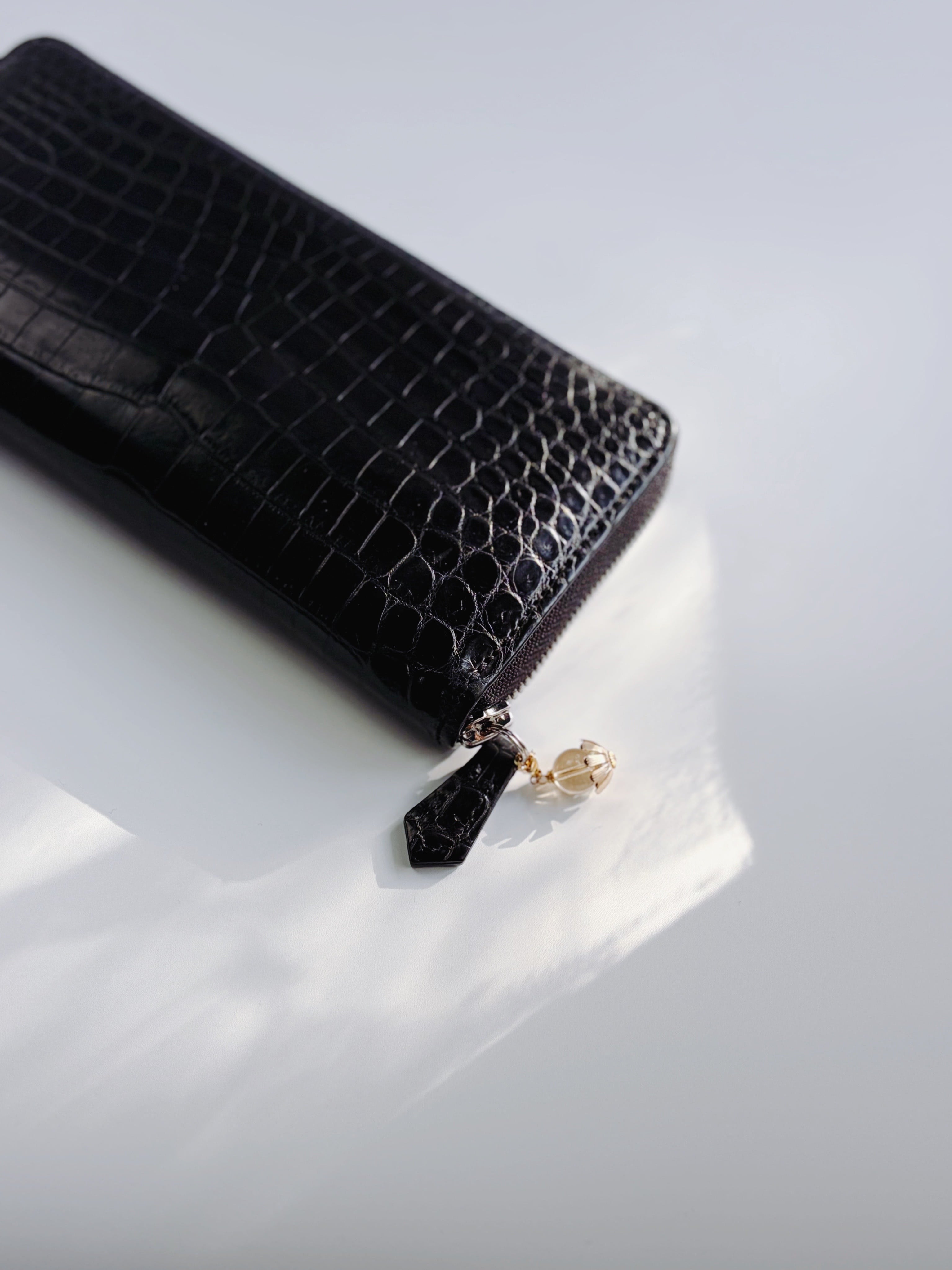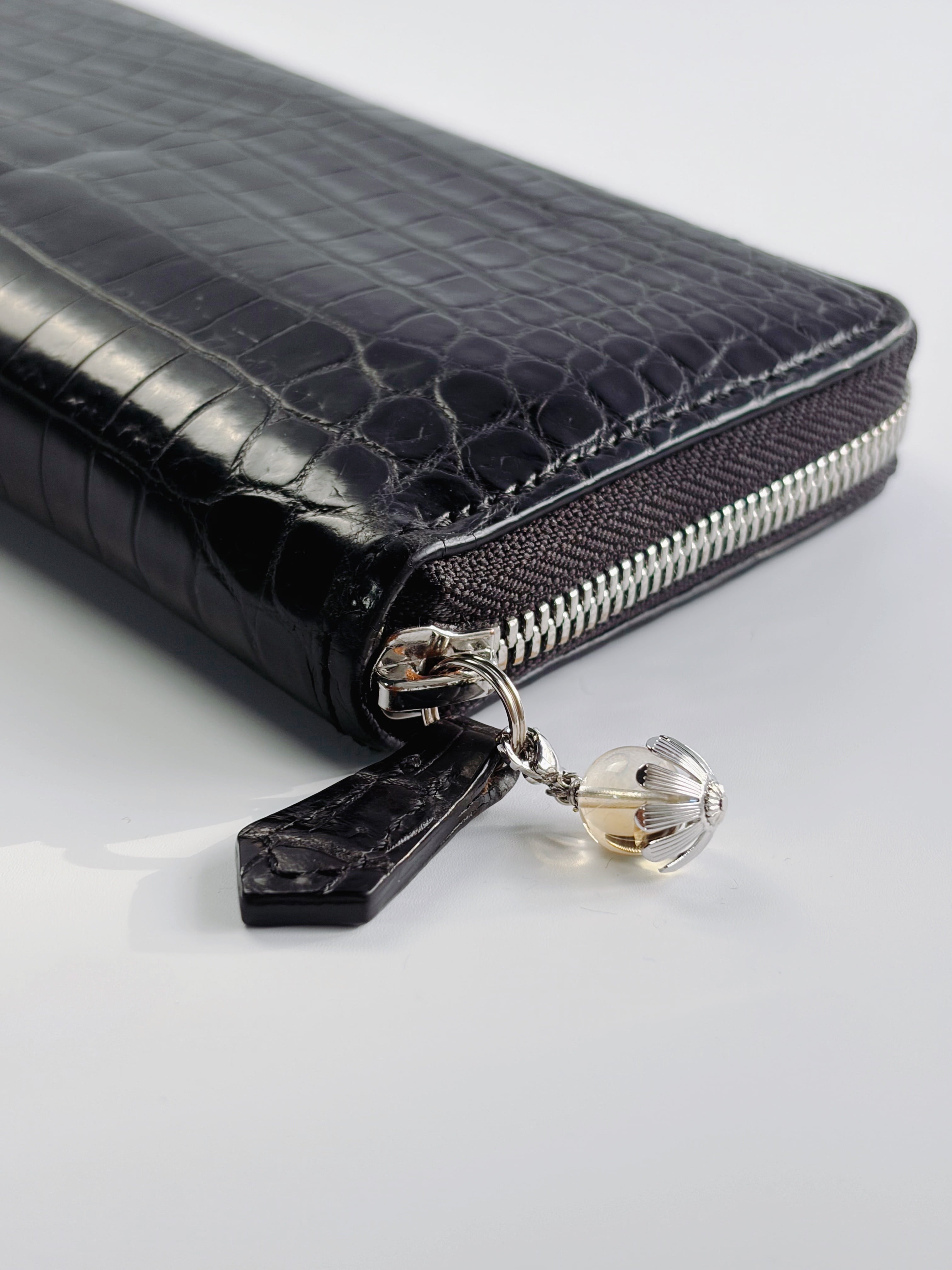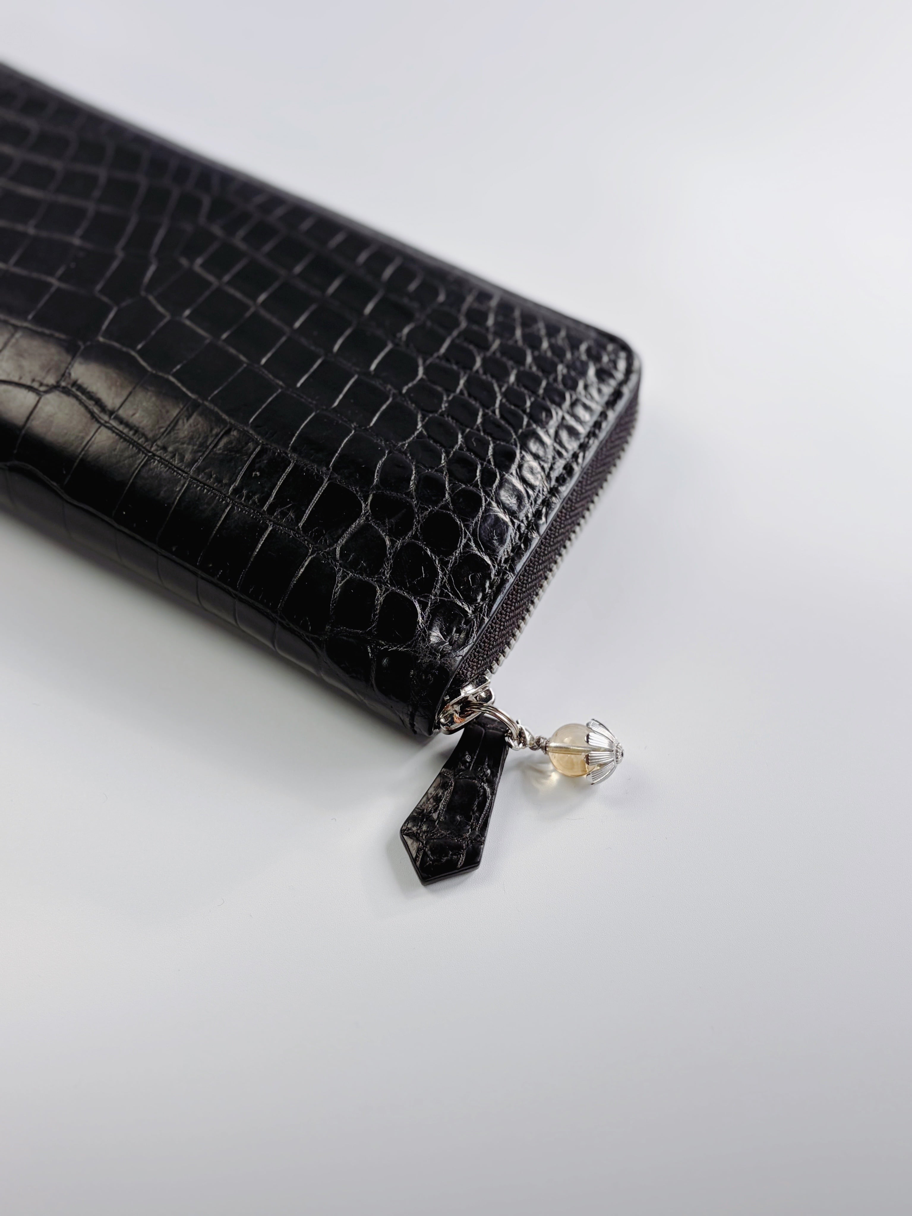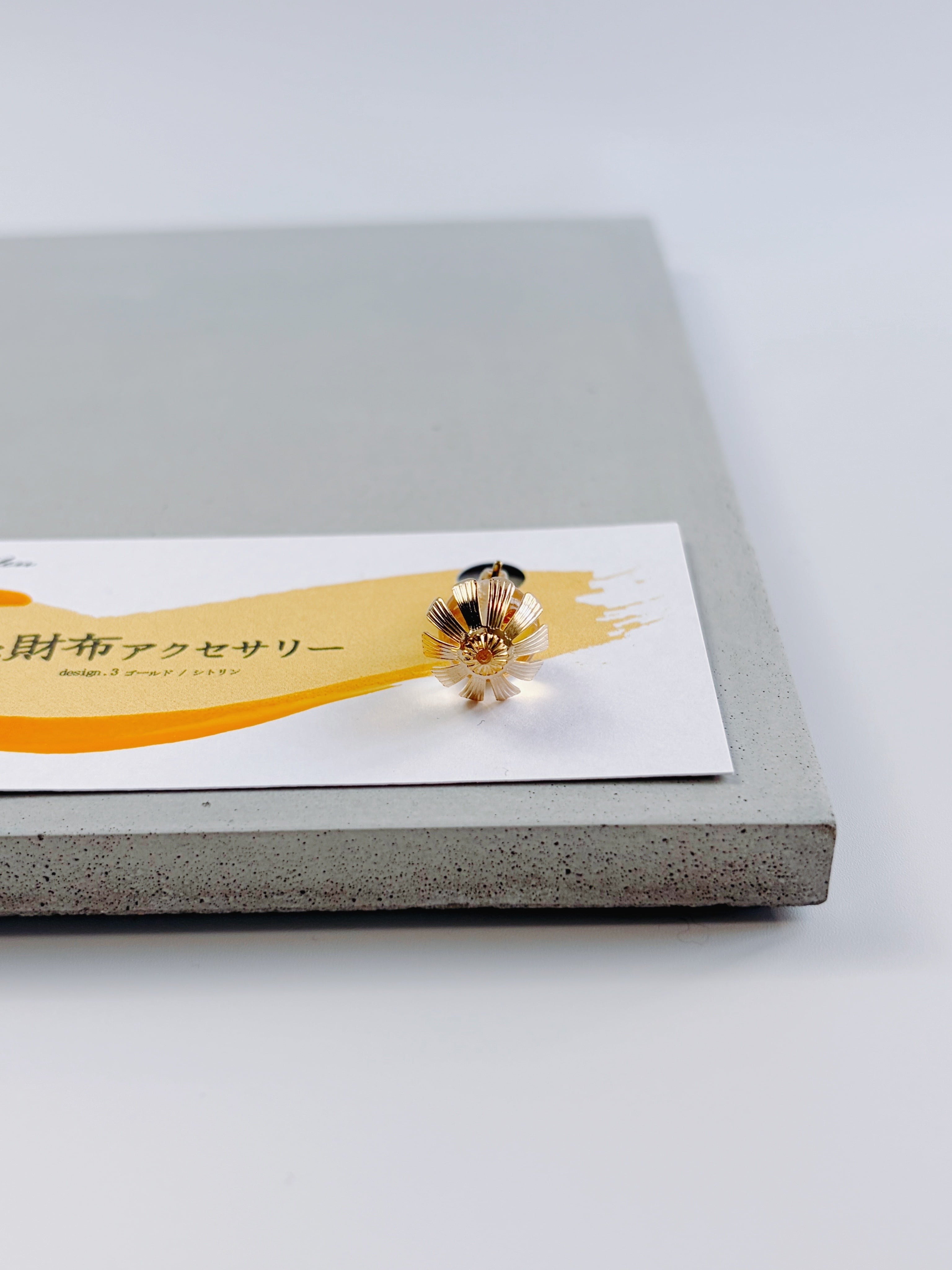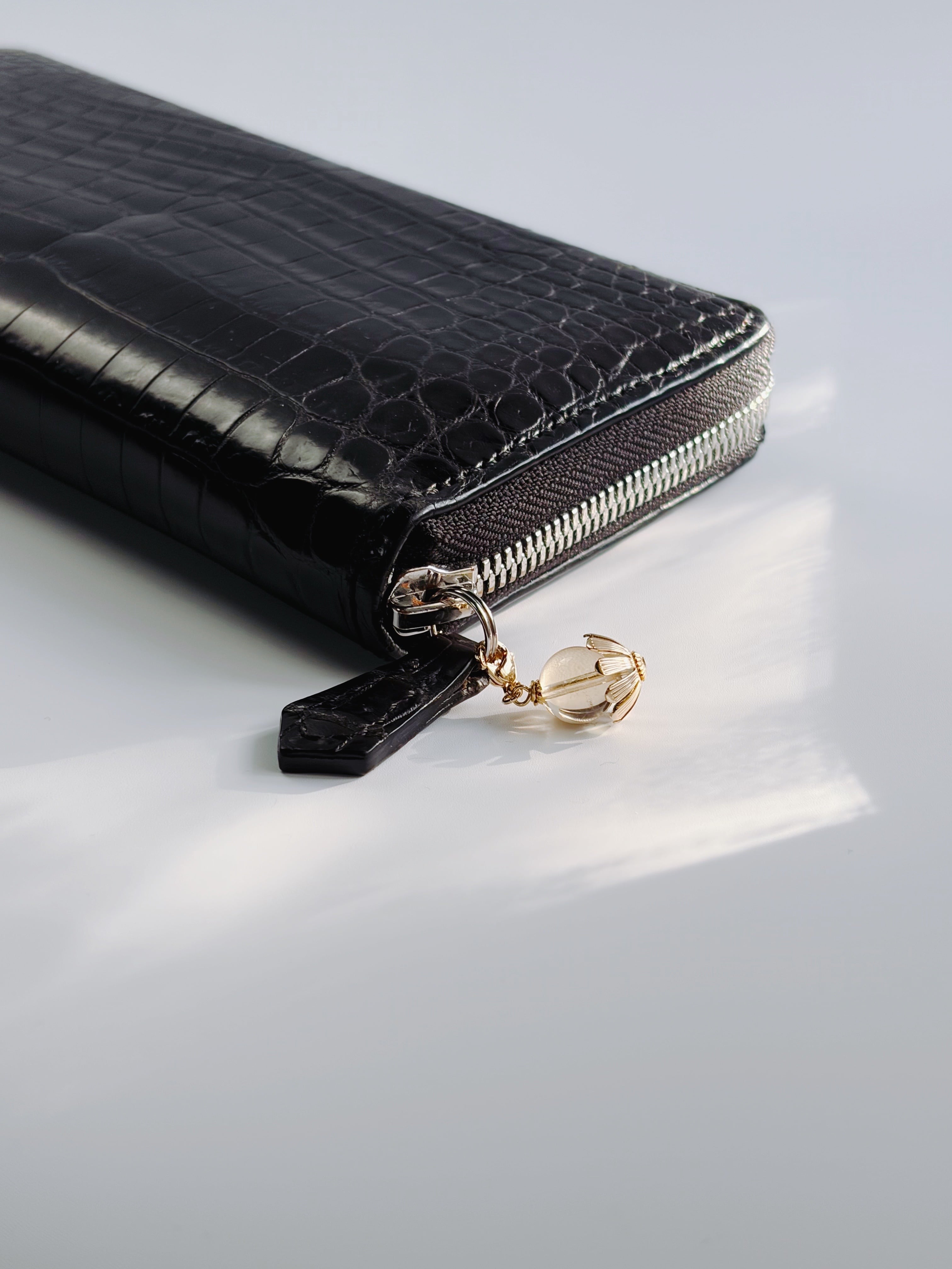 イヤリングでも人気の高い、大人のための豪華な装飾。石が少し浮いているように見えるこだわりのフォルムが、奥行きのある高級感を演出します。お財布をクラスアップさせる、ジュエリーのような存在感を楽しみたい方に。
