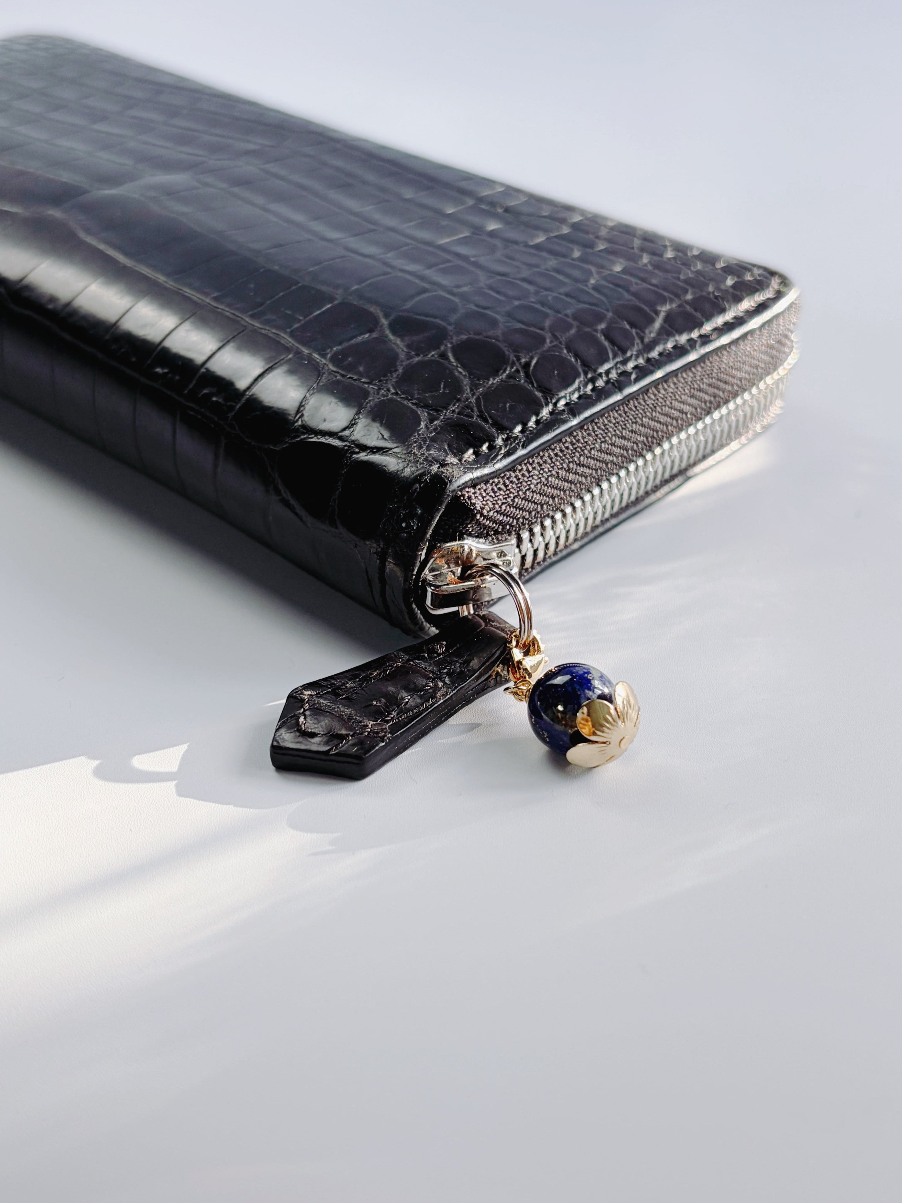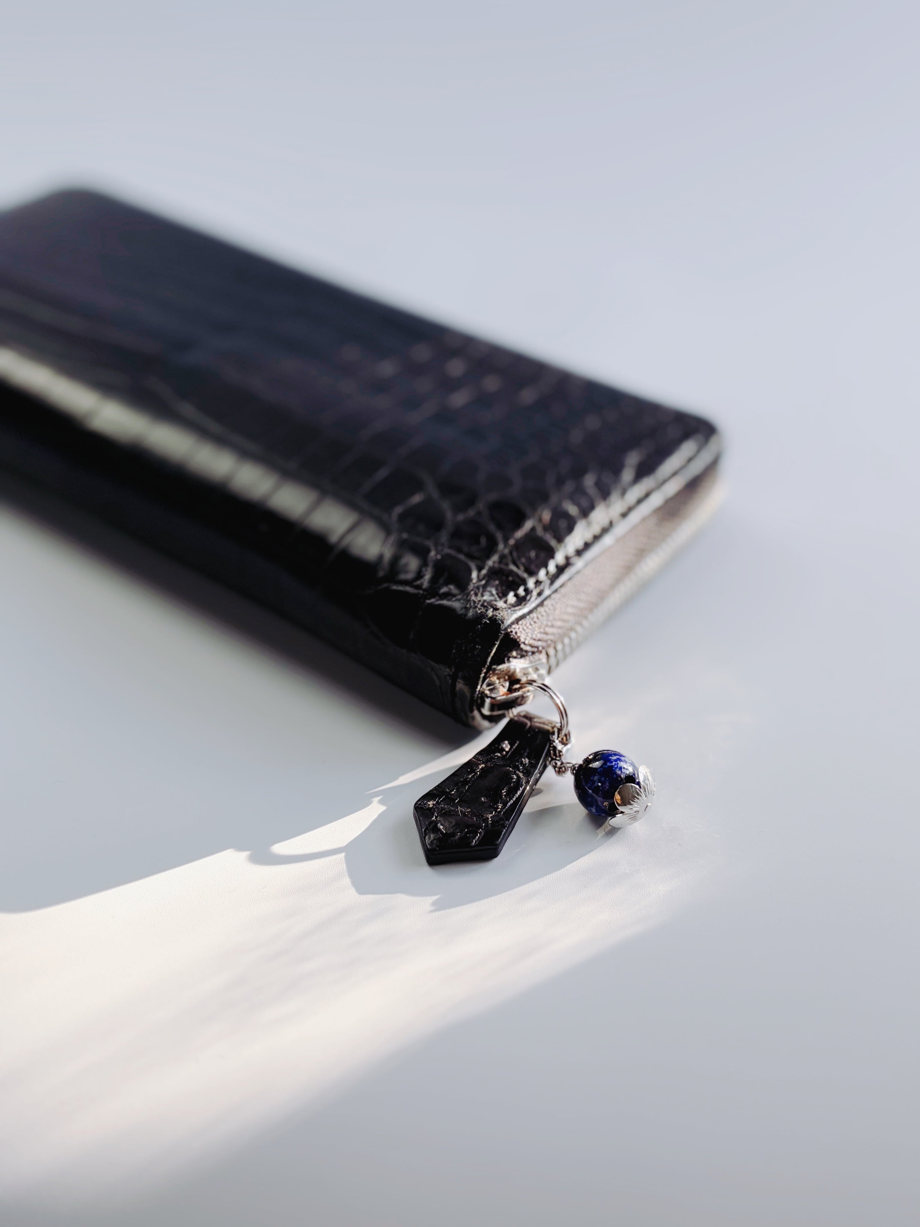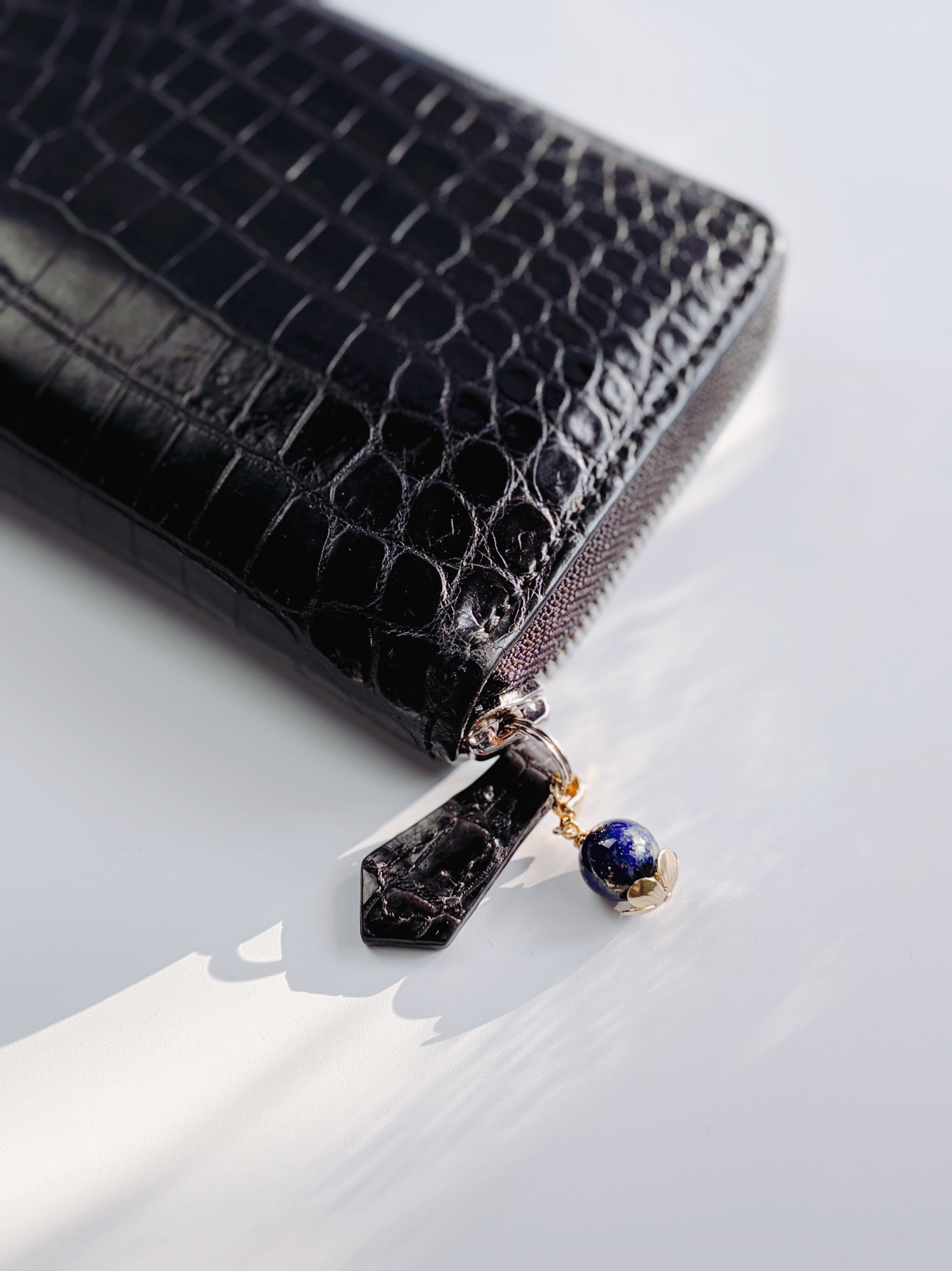 天然石を包み込む繊細な座金パーツが、お財布に優美な彩りを添えるデザイン。主張しすぎない程よいボリューム感でありながら、華やかさを持ち合わせた、どんなシーンにも寄り添う洗練された仕上がりです。