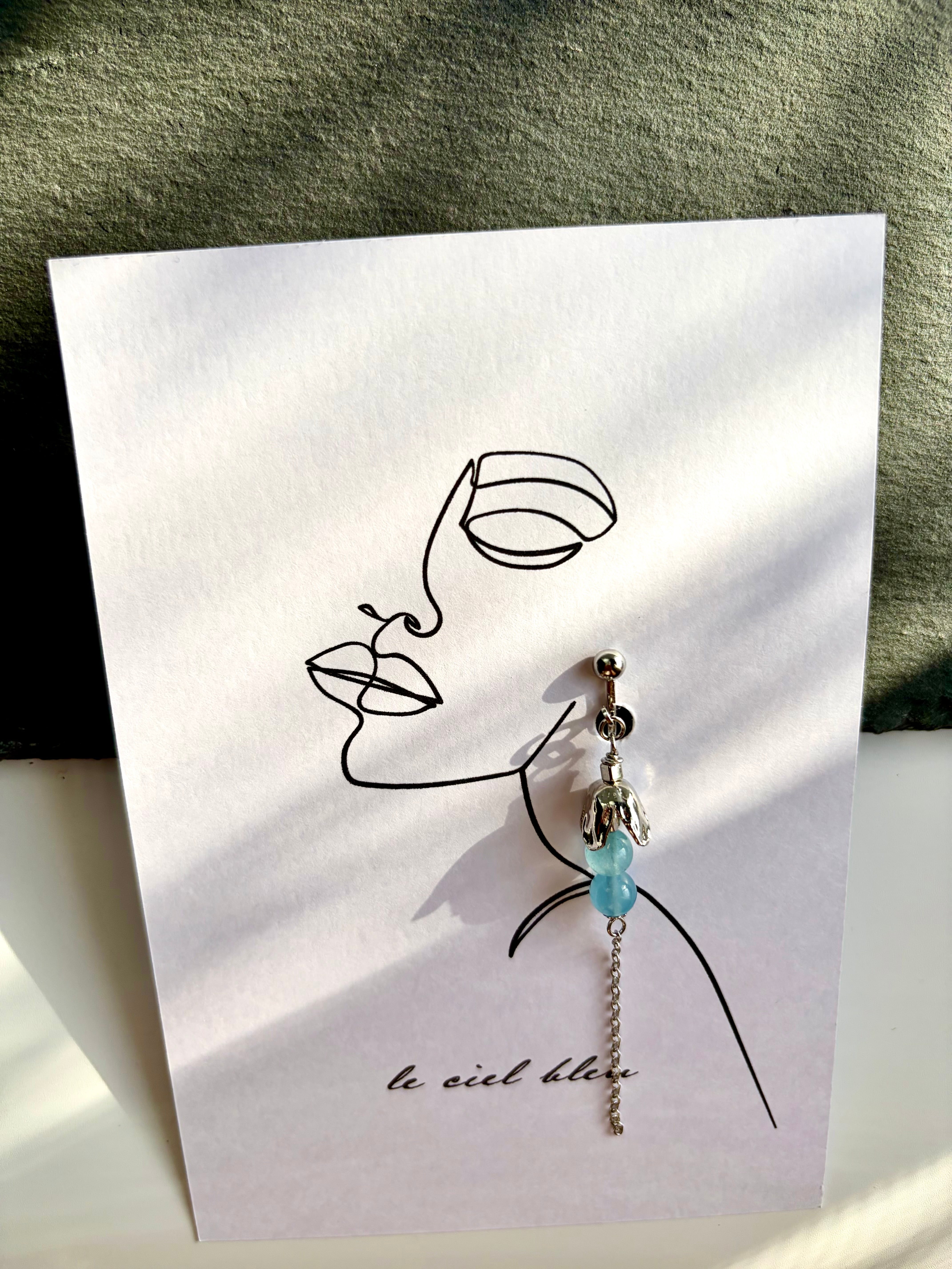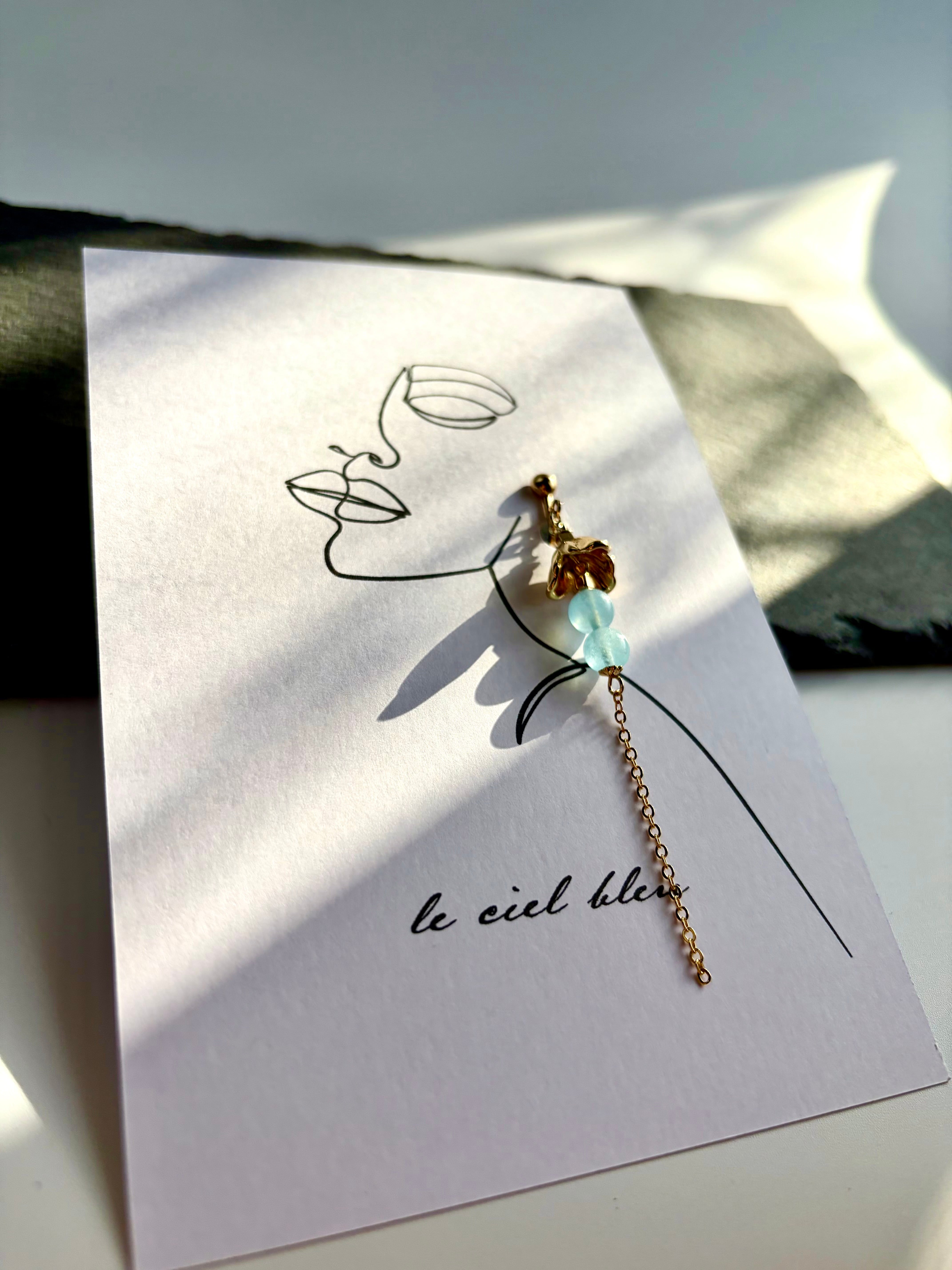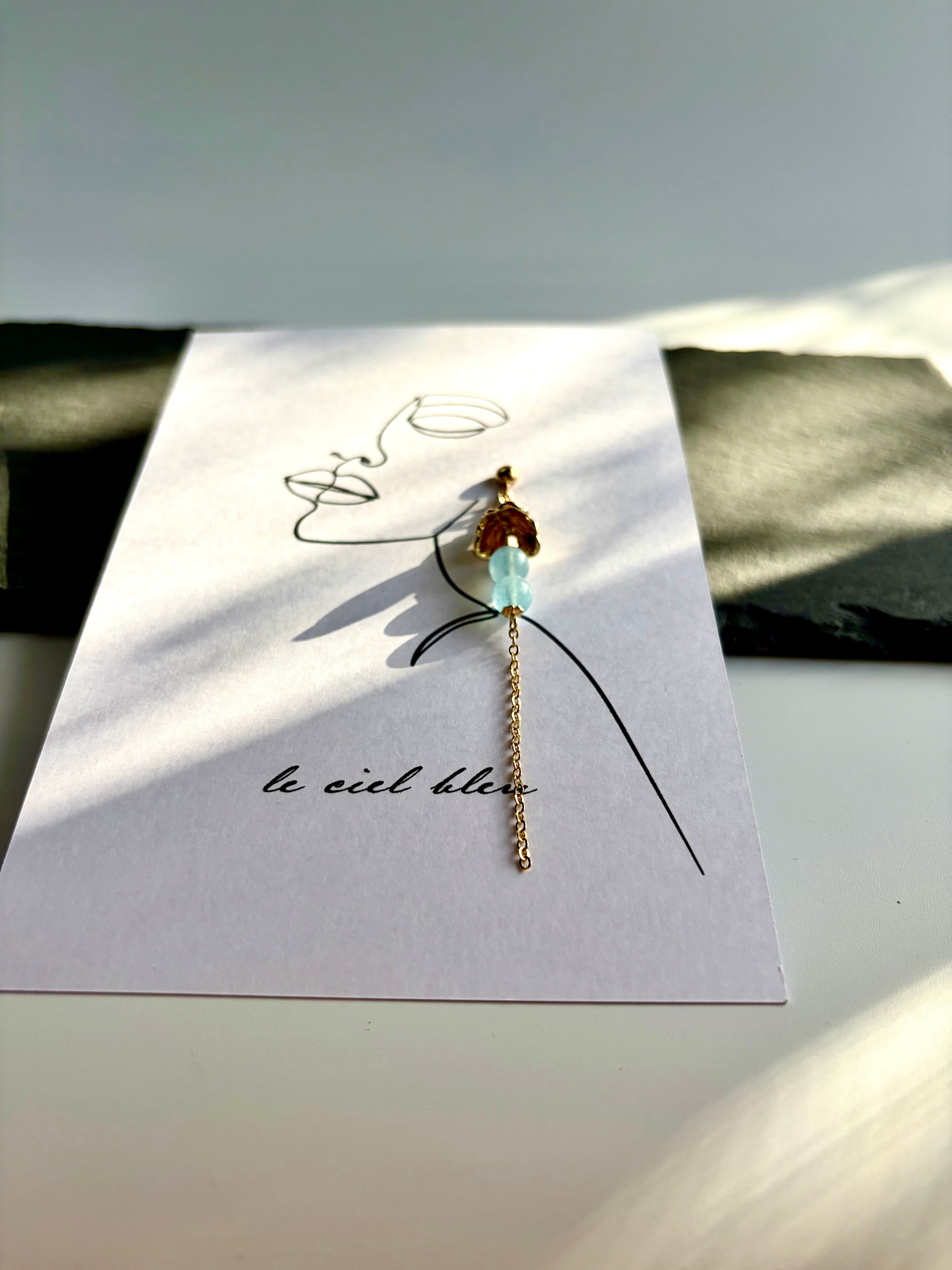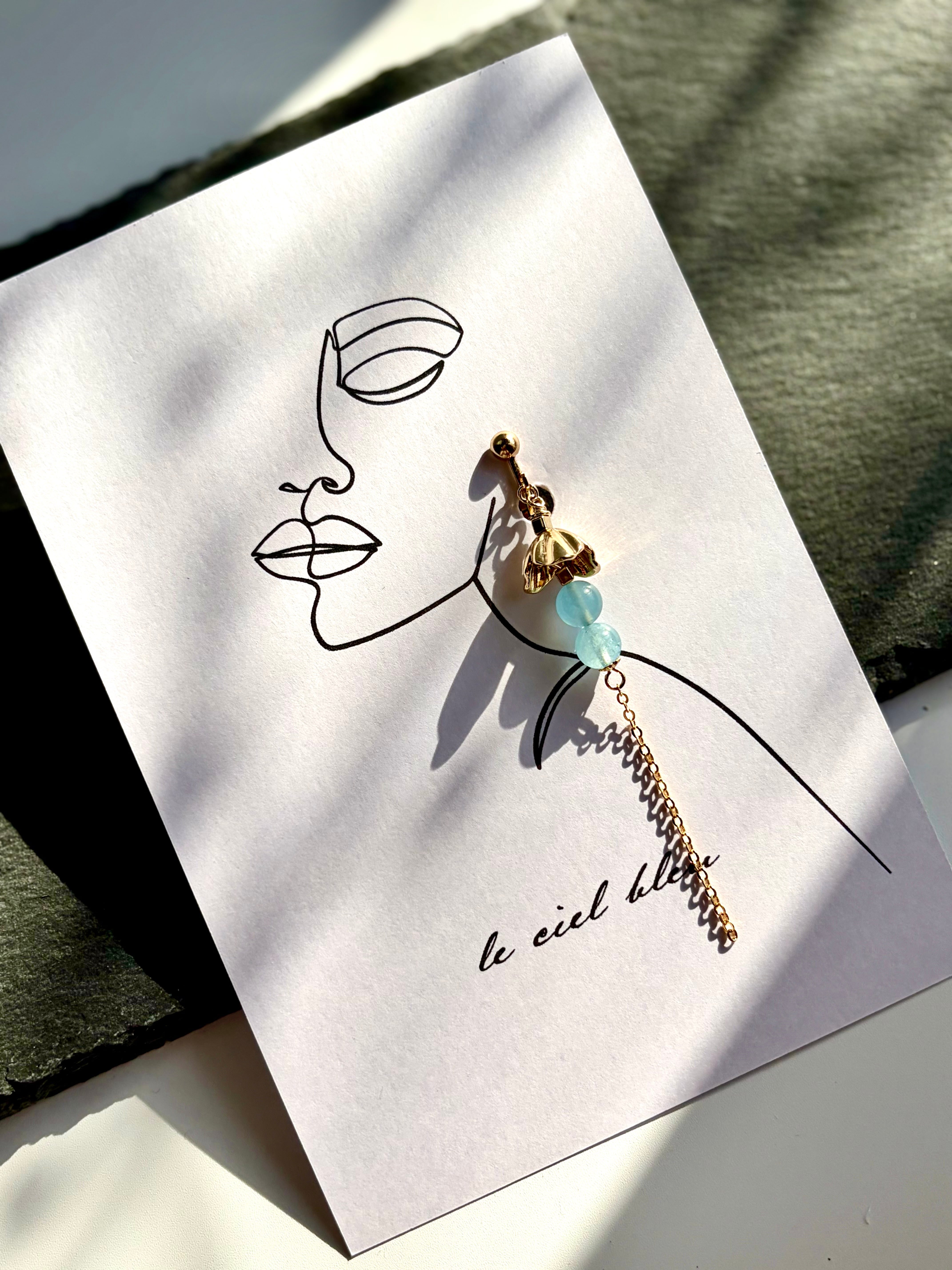 ゴールドやシルバーの繊細なパーツと、二粒並んだアクアマリンが、こぼれ落ちる小さなしずくのように耳元を彩ります。