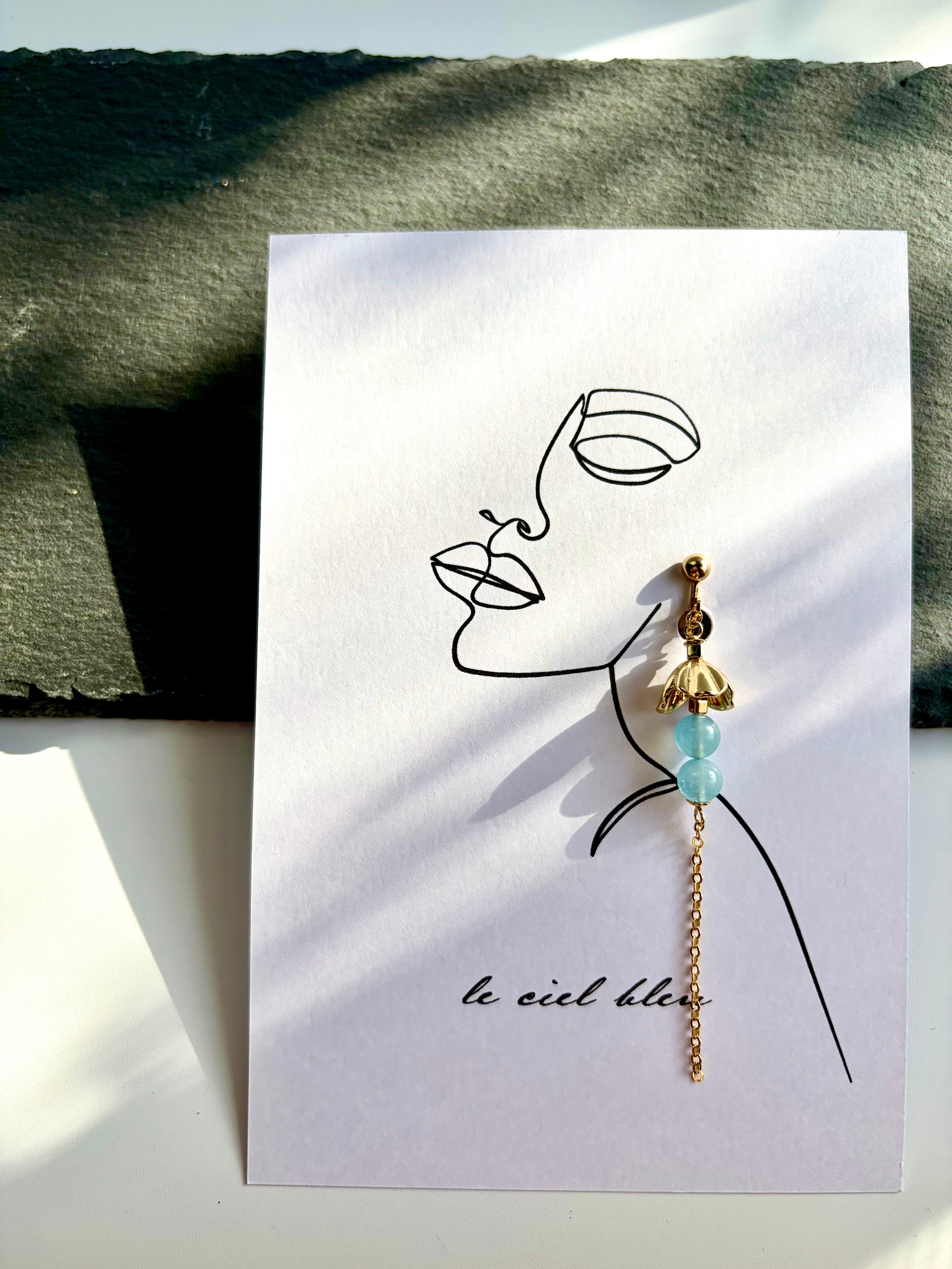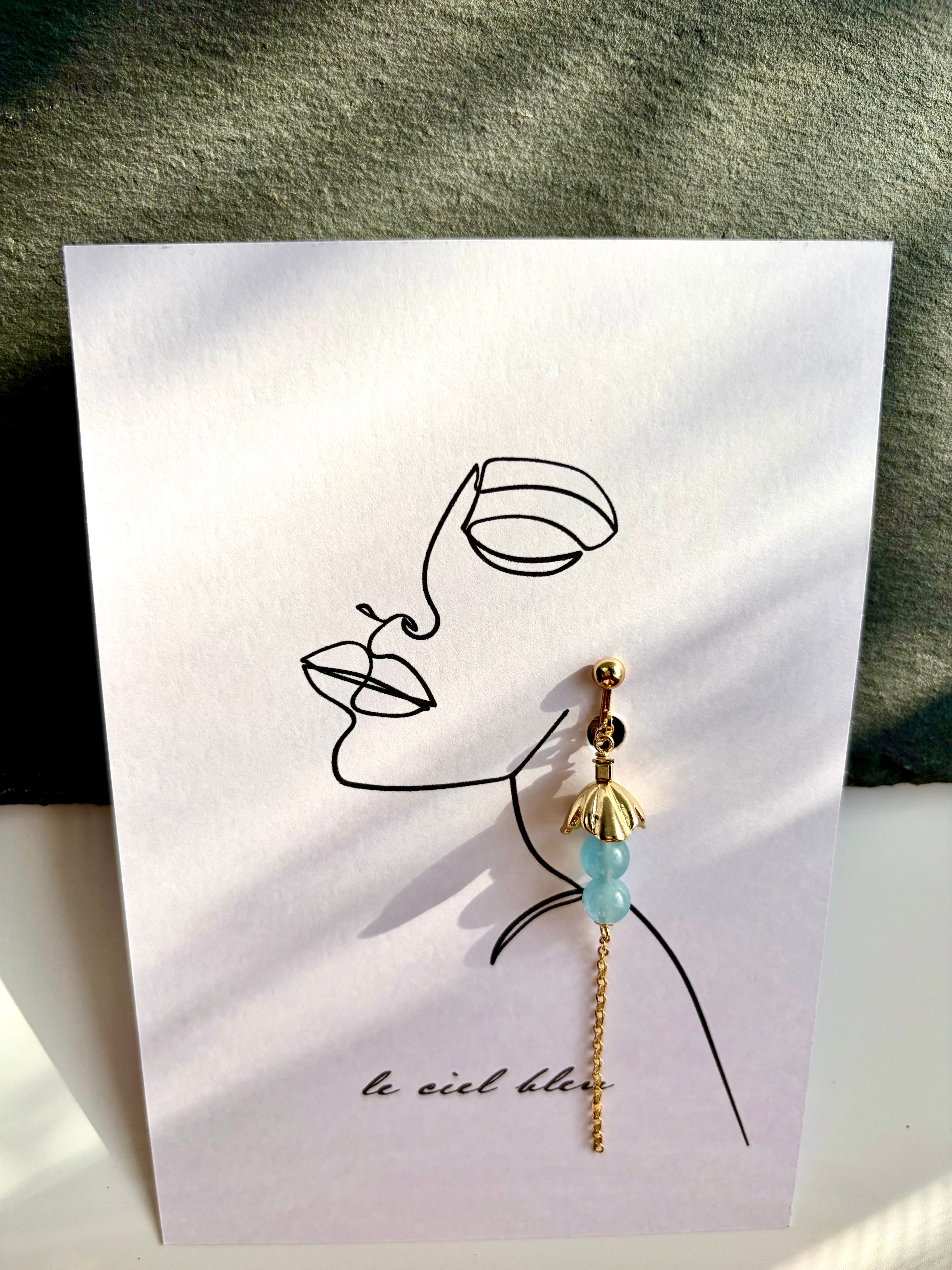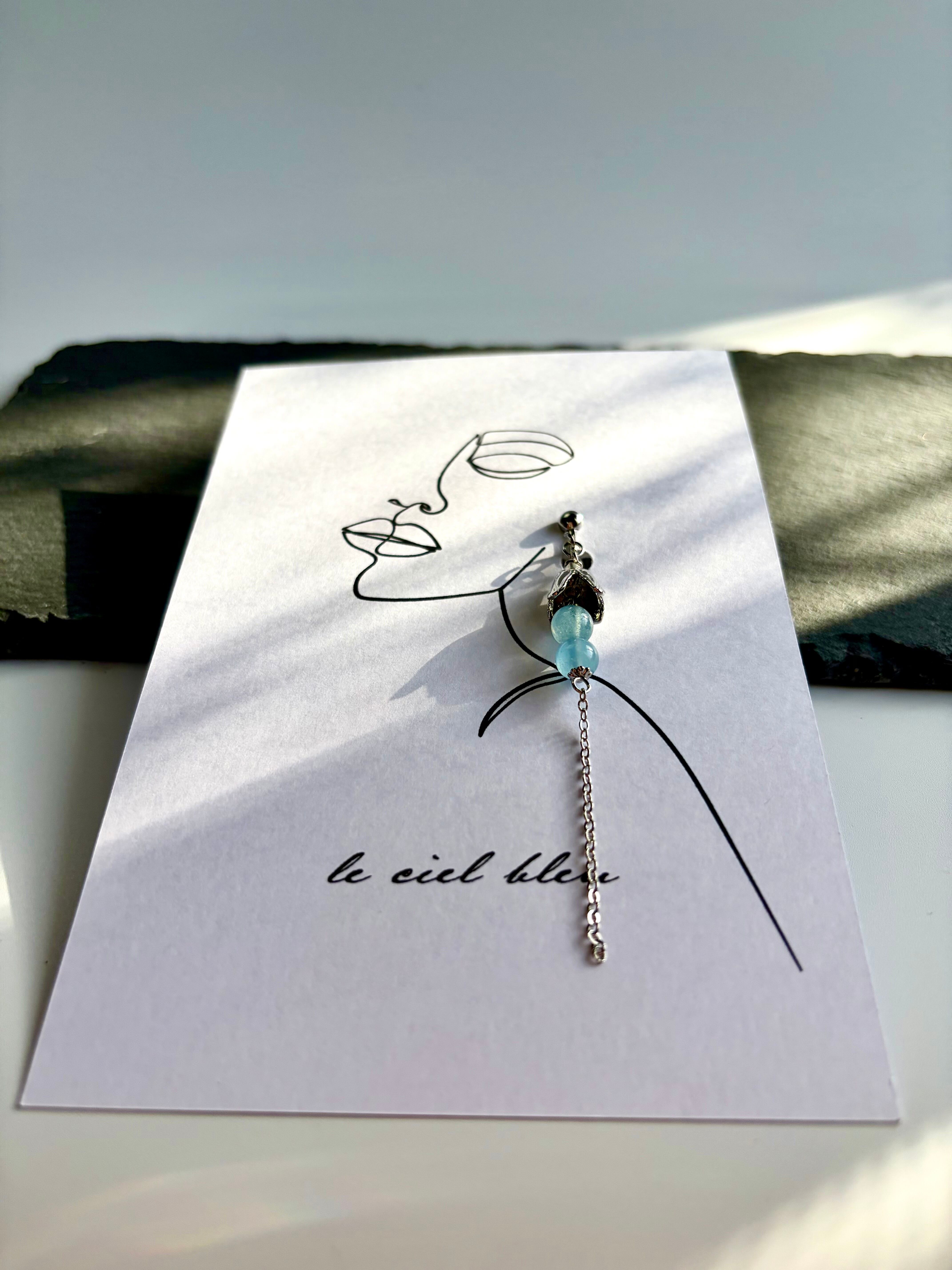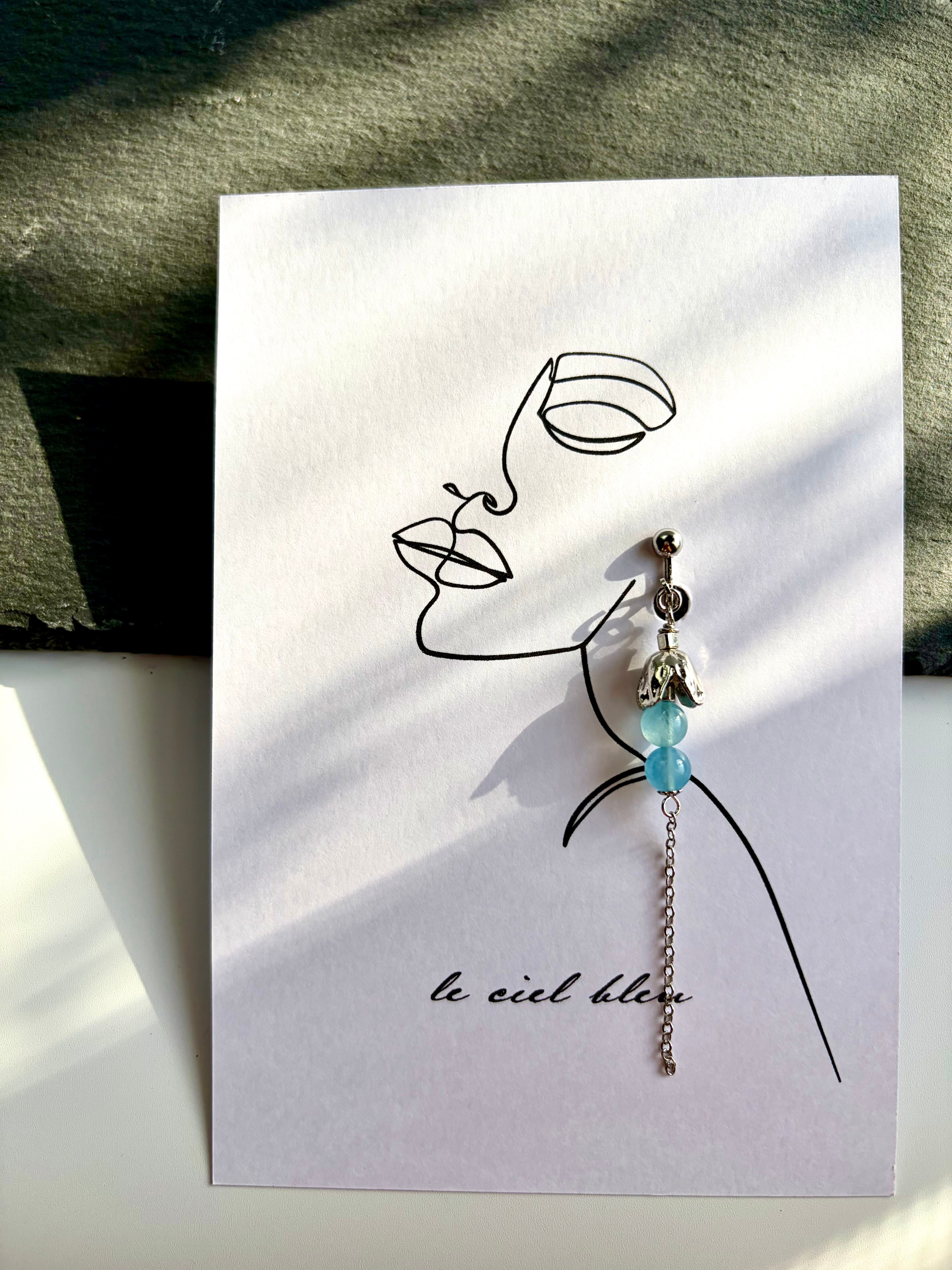ゴールドやシルバーの繊細なパーツと、二粒並んだアクアマリンが、こぼれ落ちる小さなしずくのように耳元を彩ります。