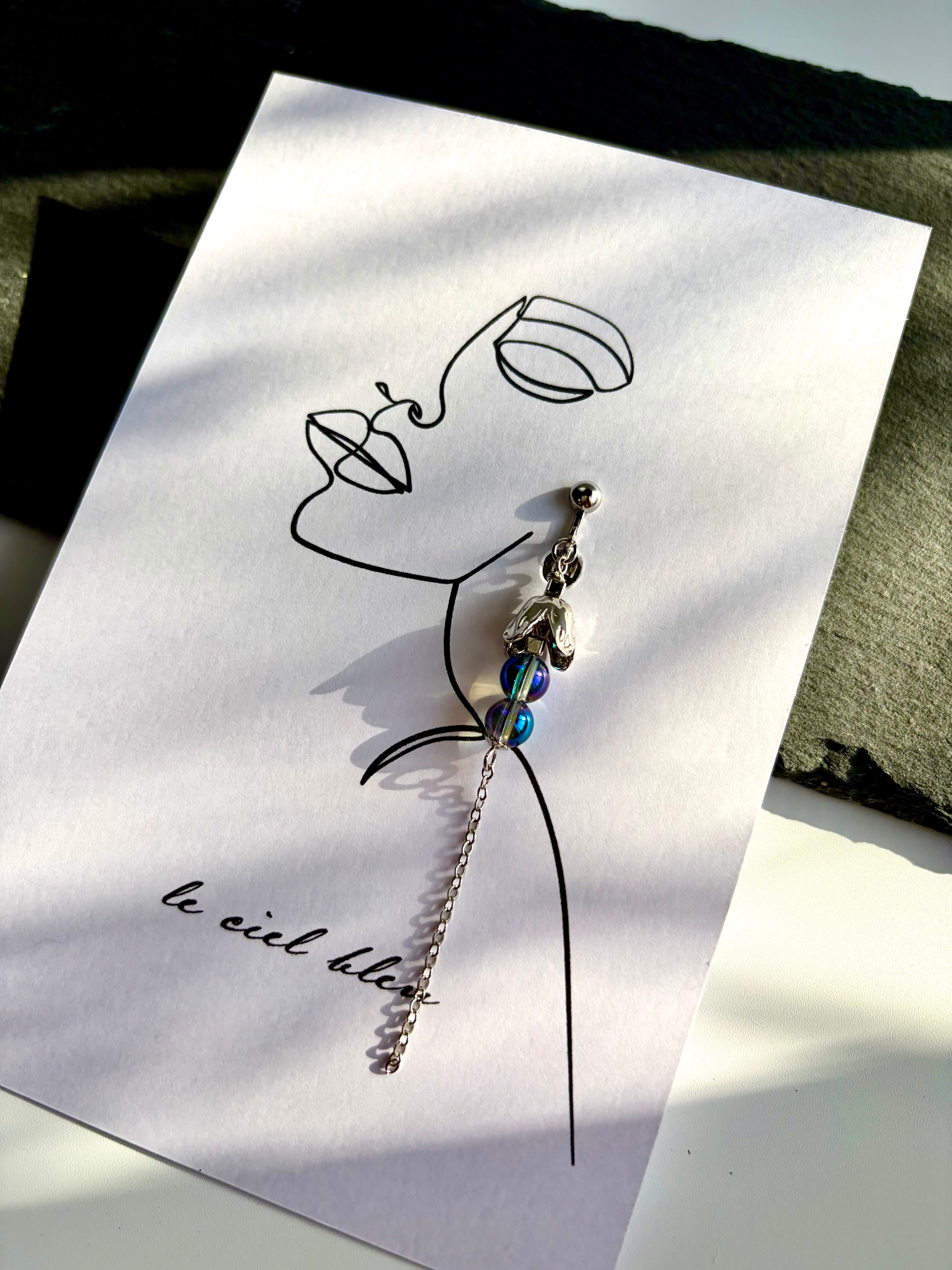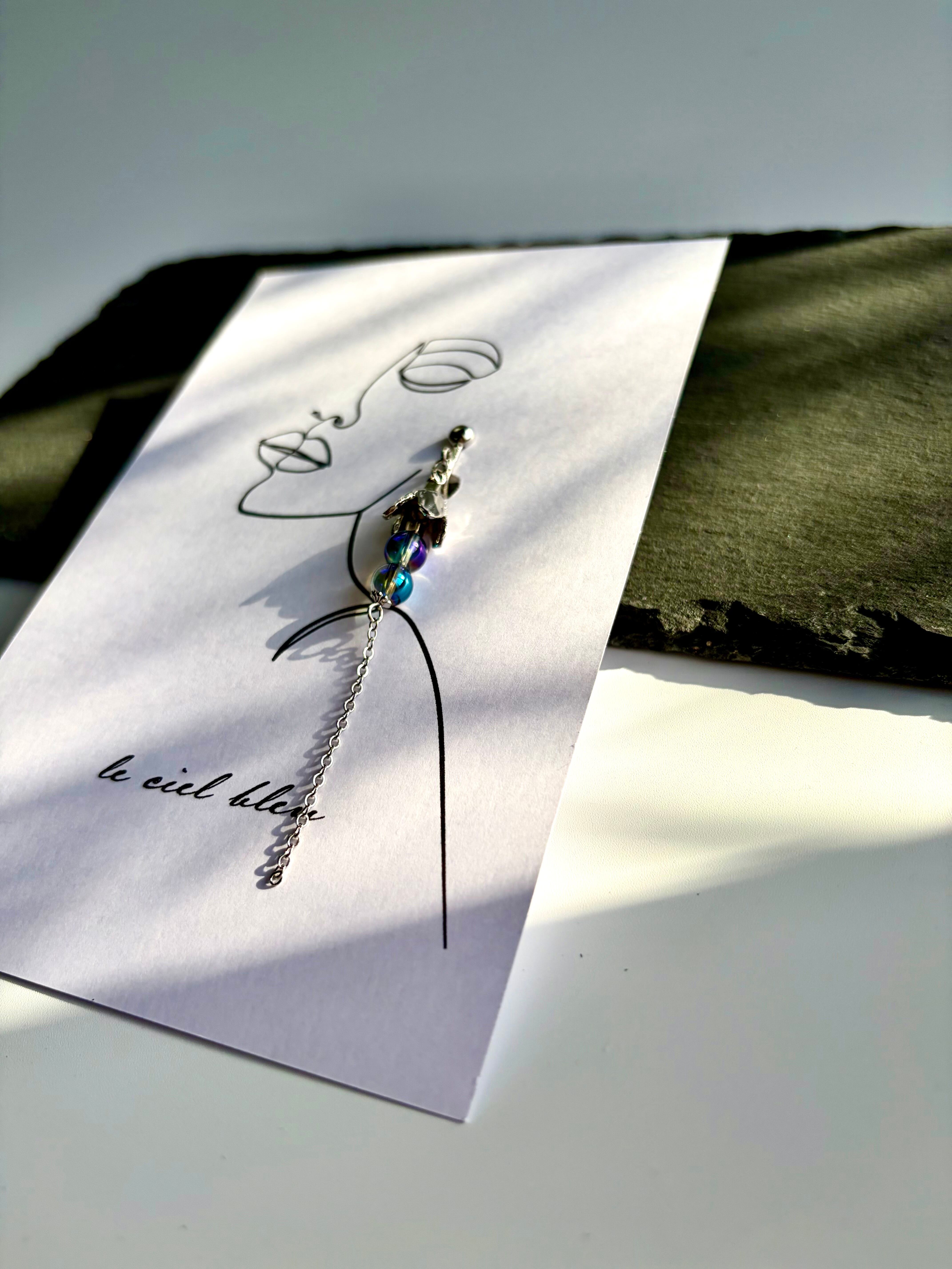角度によって表情を変える二粒のアクアオーラが、こぼれ落ちる小さなしずくのように耳元で光を反射します。