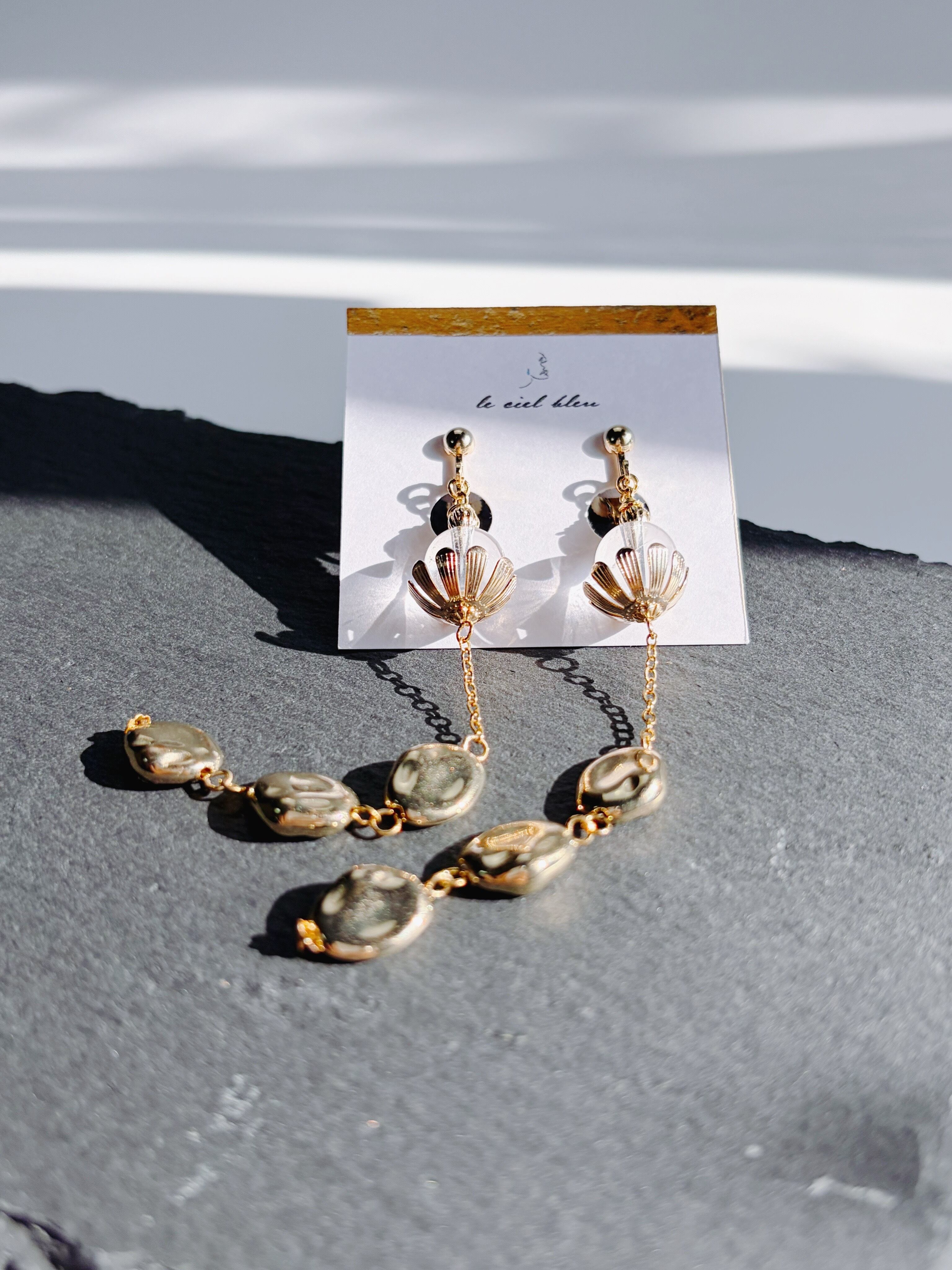 le ciel bleuでも群を抜いて長さのあるシルエット。この直線的なラインが、首筋をスッと長く、横顔をシャープに演出します。縦のラインを強調することで、大ぶりなデザインながらも、どこか凛とした知的な印象を与えてくれます。