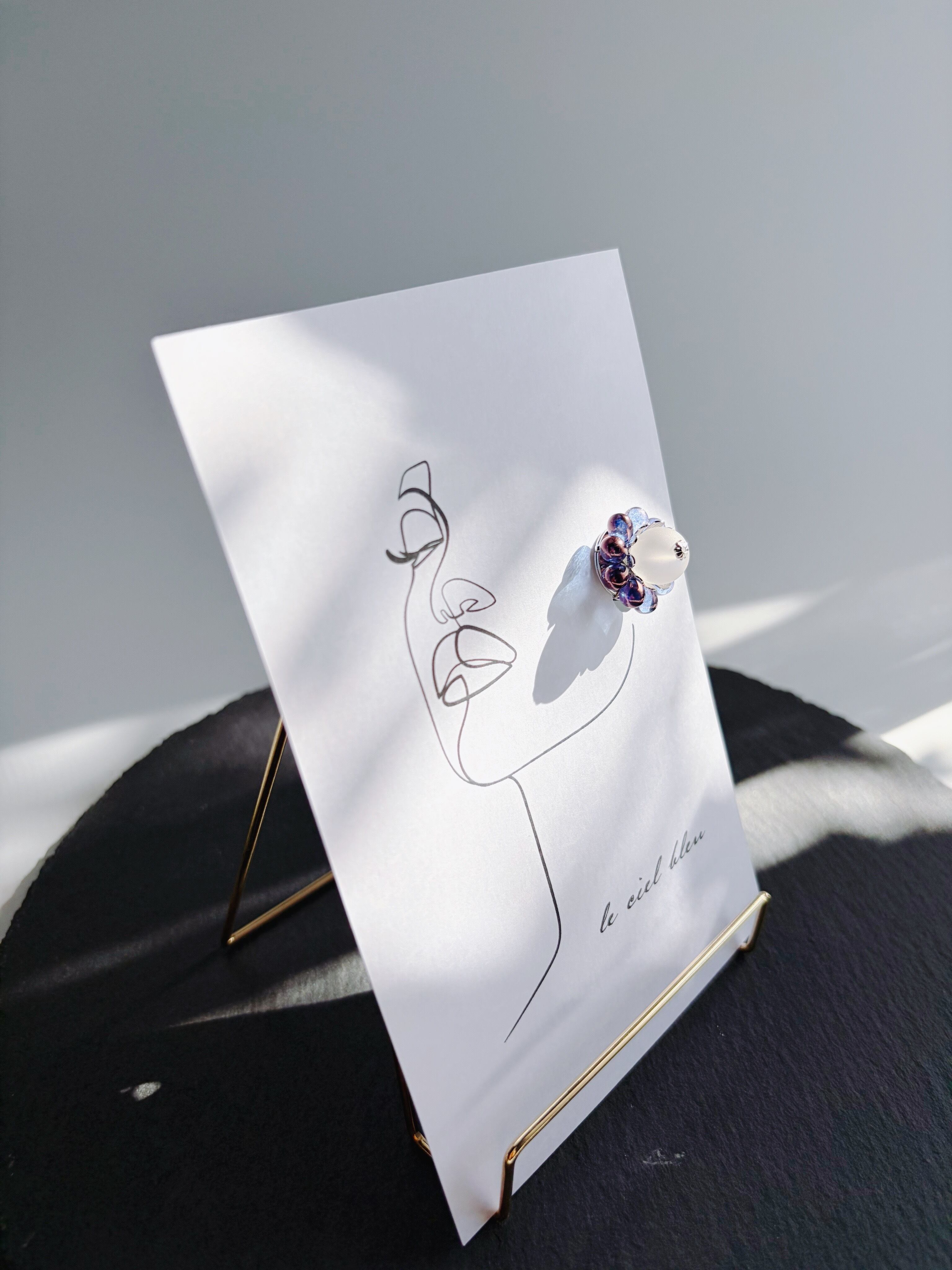 周りを取り囲むのは、角度によって色合いを変える、奥行きのある紫。単なる一色ではない、深みのある輝きがフロスト水晶の「白」と共鳴し、雨に濡れた花びらのような、幻想的なオーラを纏わせます。