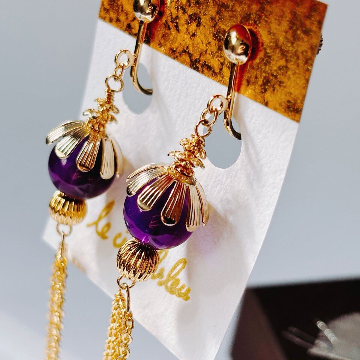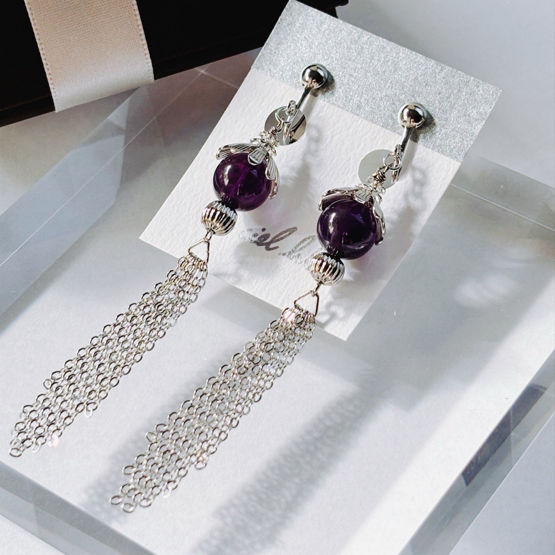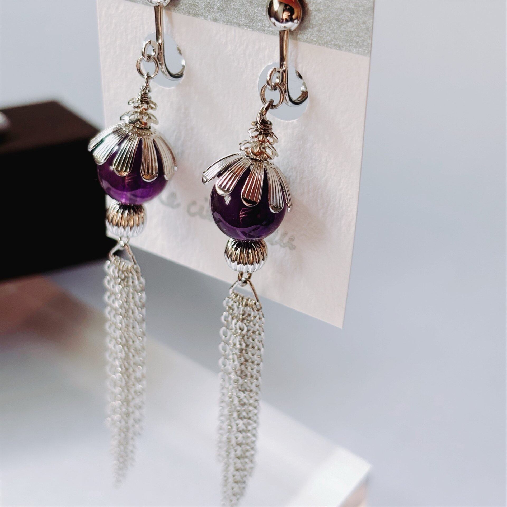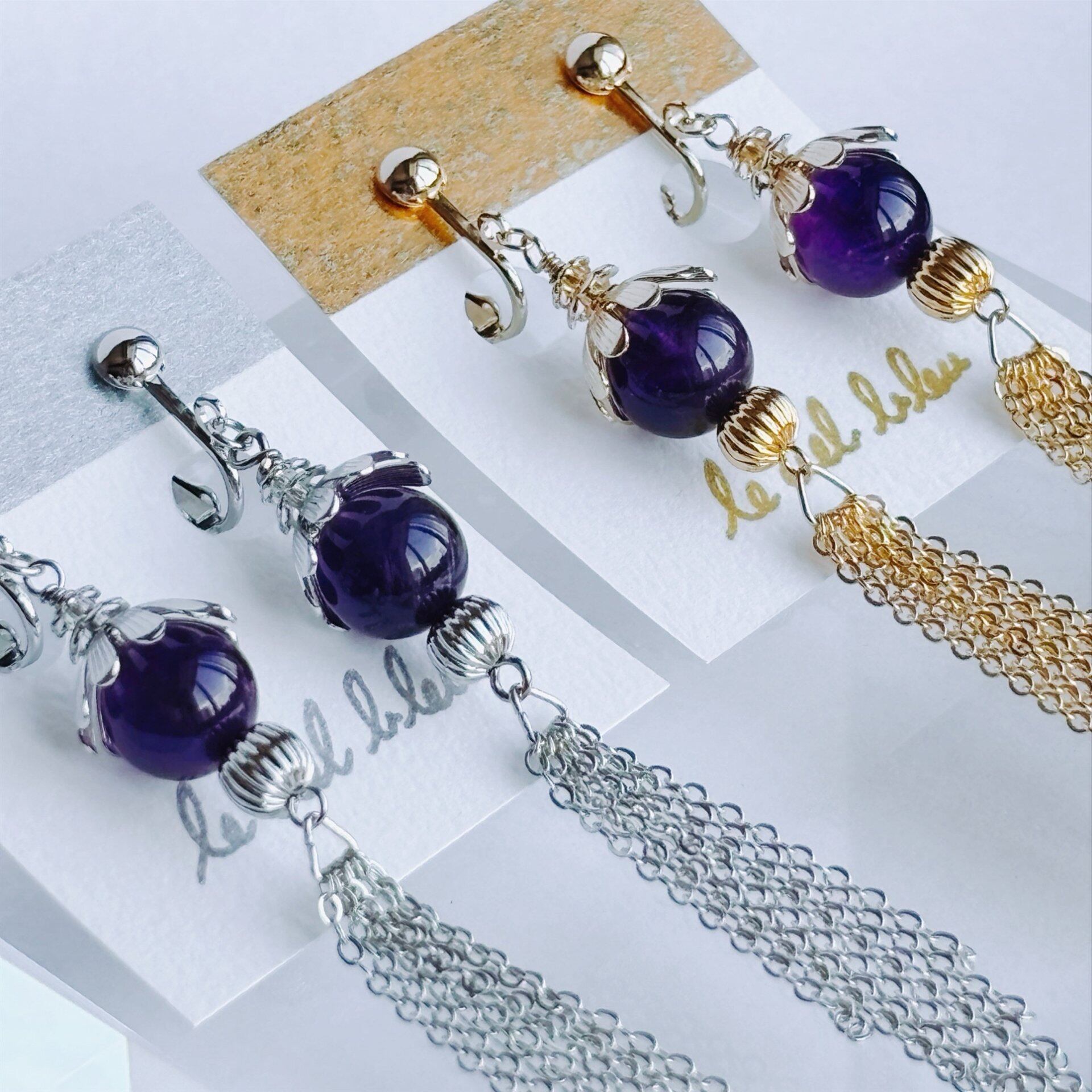 普段使いはもちろん、特別な日にもふさわしいアイテムです。アメジストの美しい紫色が、どんなスタイルにも上品に馴染み、あなたの個性を引き立ててくれます。揺れることで自然な動きを演出し、視線を惹きつけること間違いなしです。