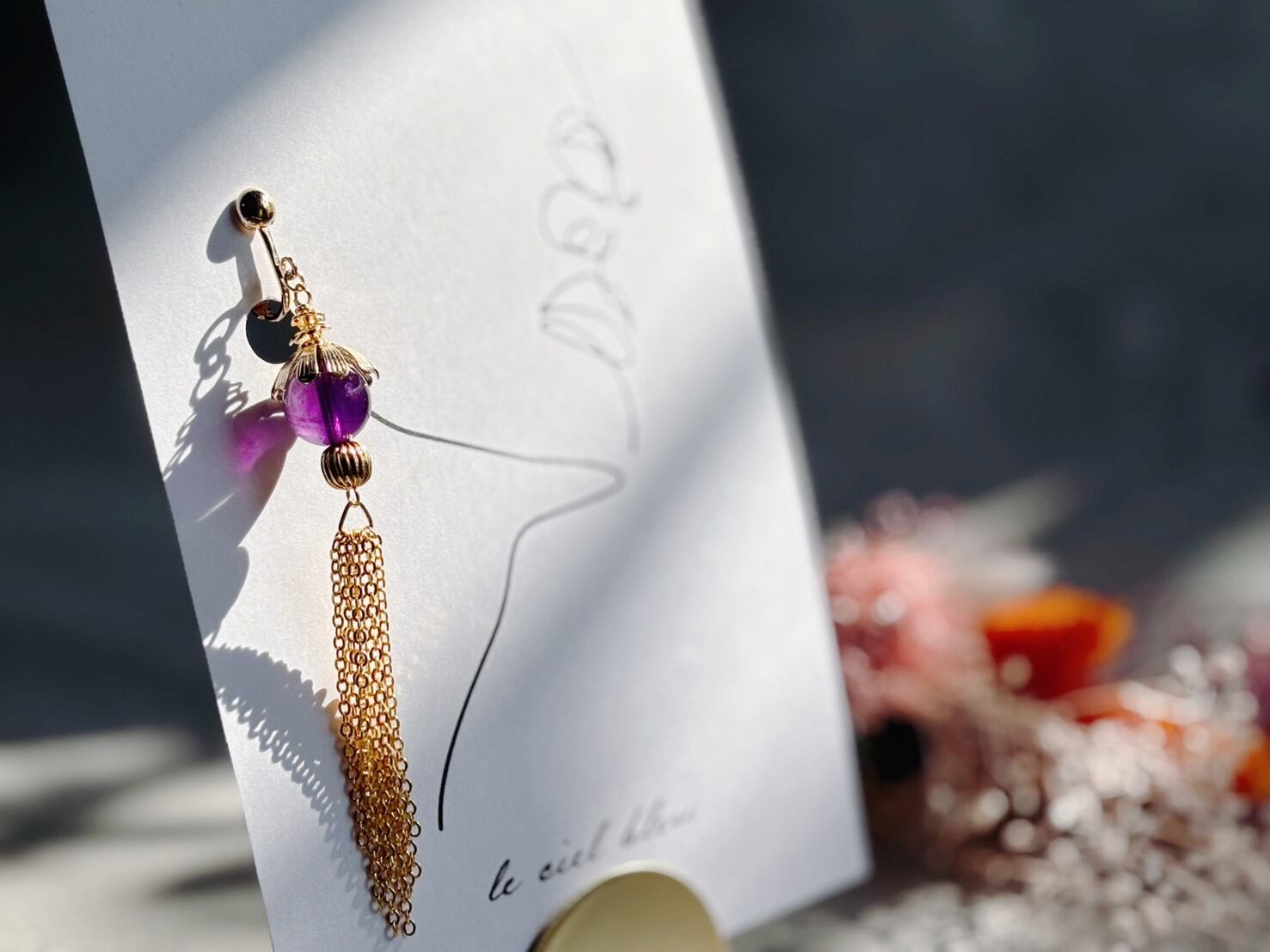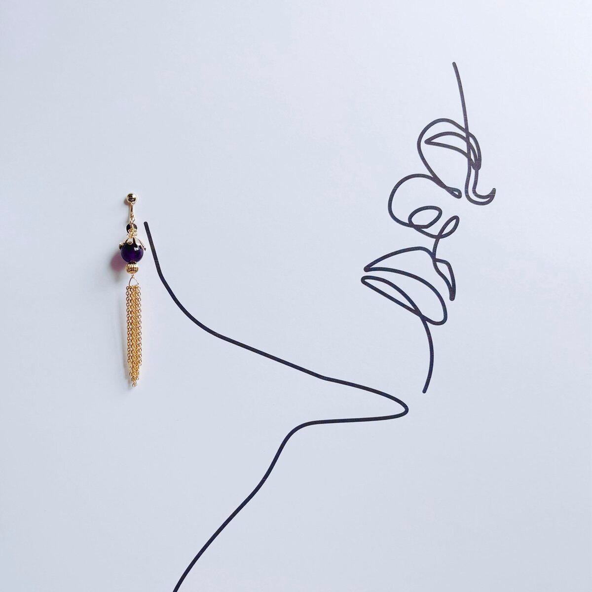 揺れ感のあるデザインが特徴的なこのイヤリングは、天然石のアメジストを使用し、ゴールドやシルバーとのコンビネーションで、華やかさを引き立てます。